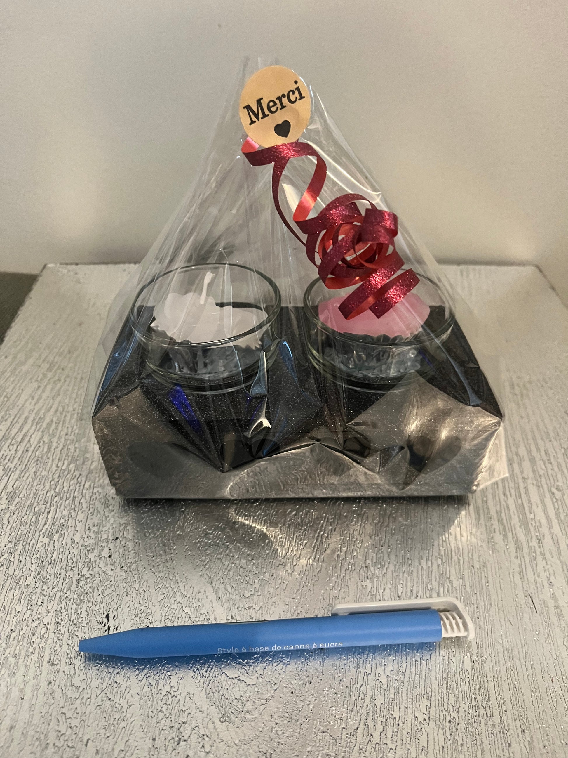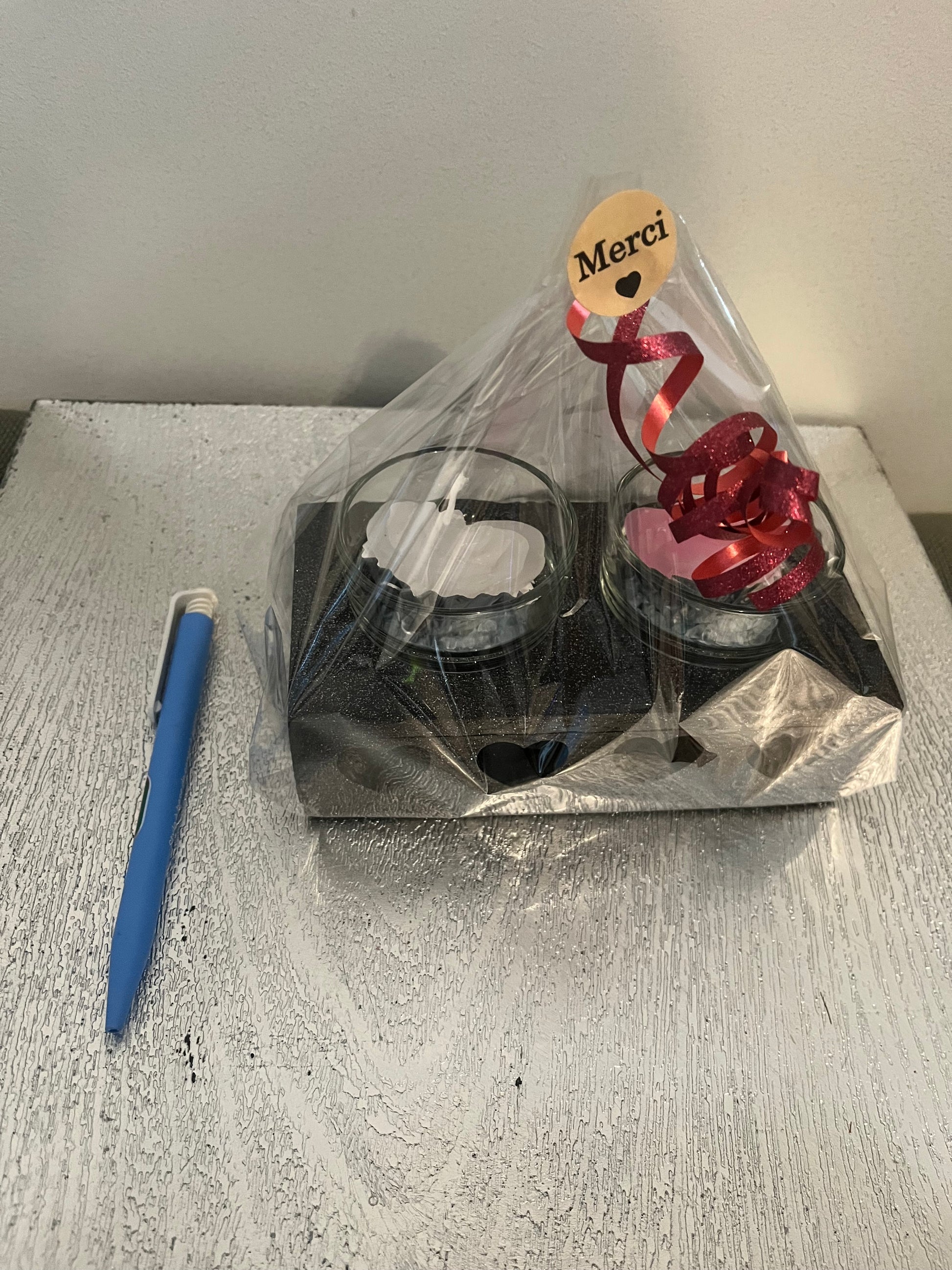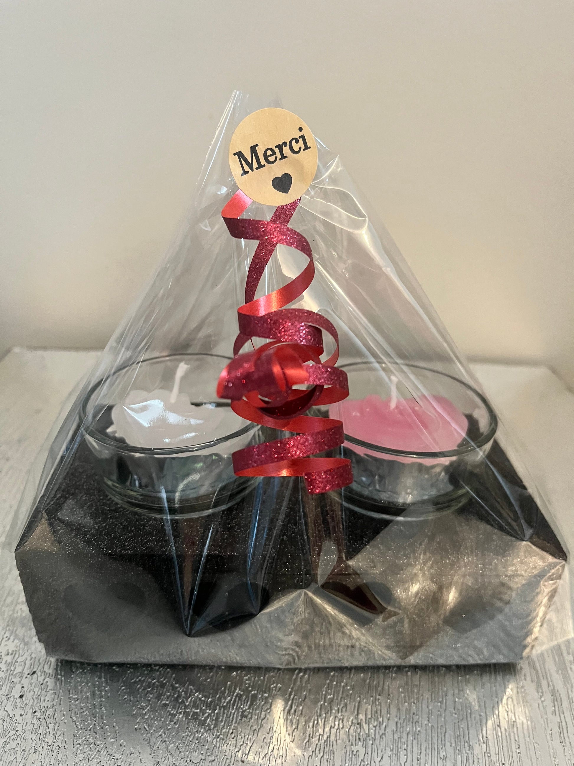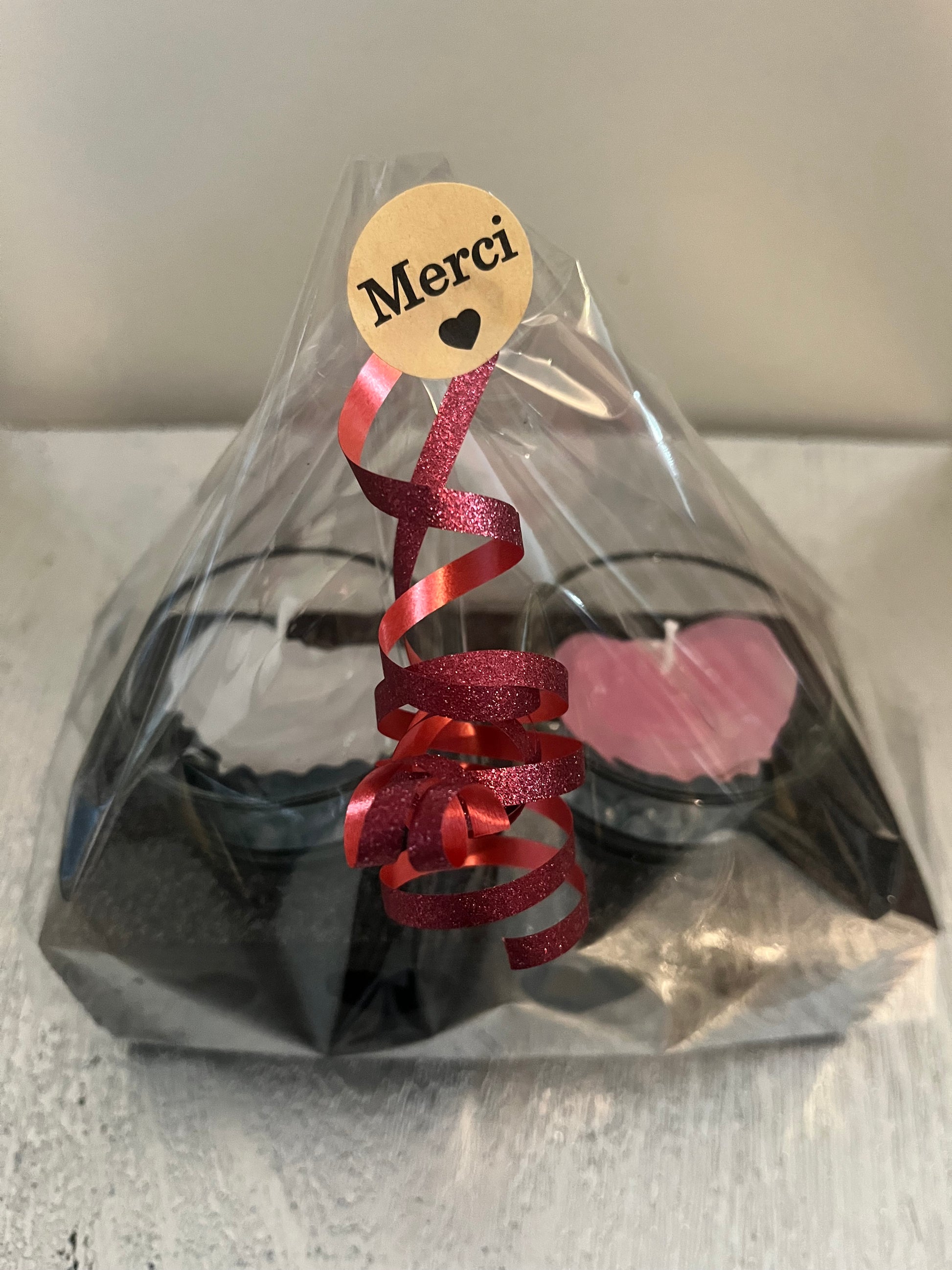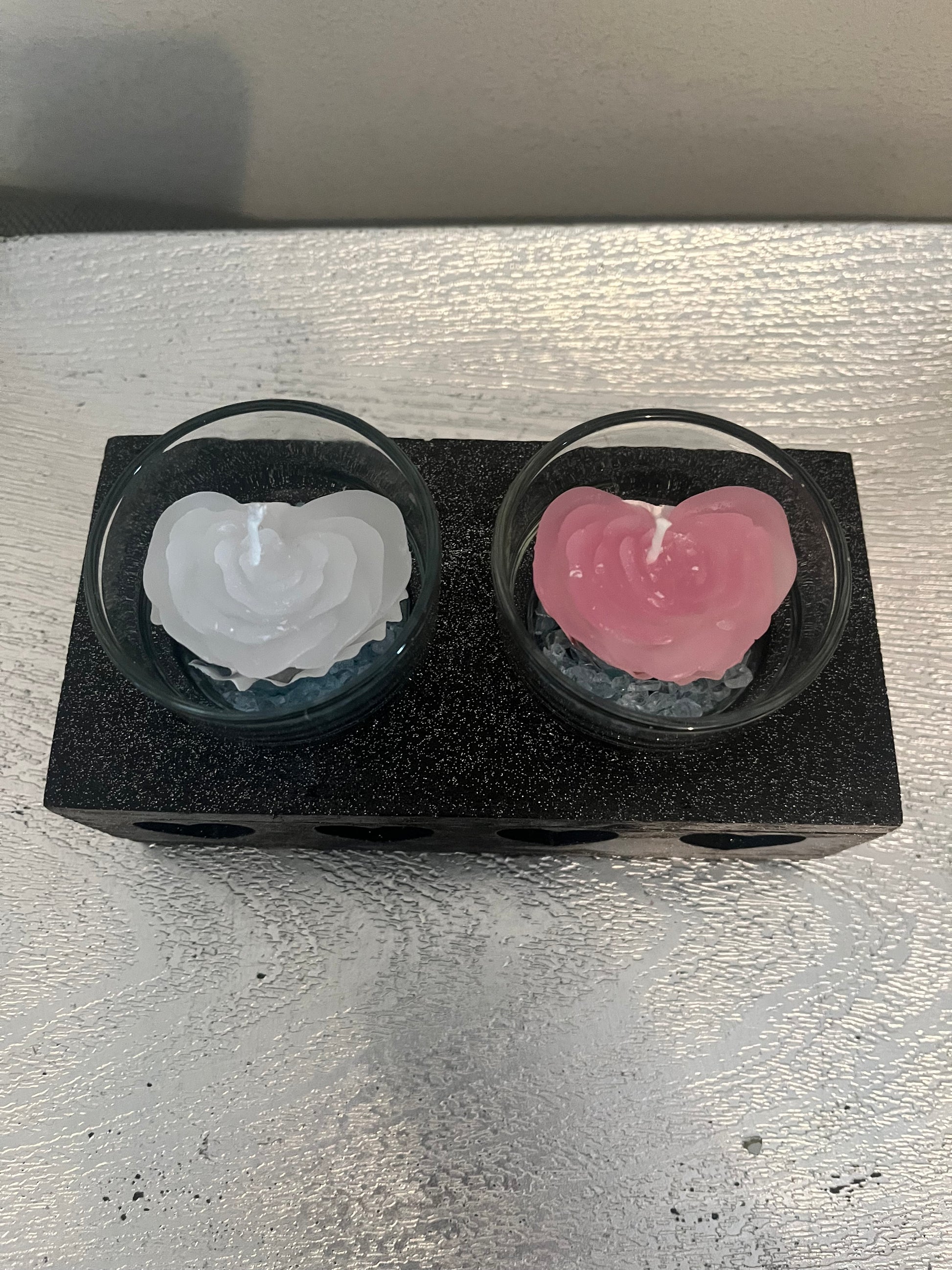Beau porte bougie en bois noir brillant, avec décors cœurs. Les bougies sont également en forme de coeur. Cet objet pourra ensuite servir de vide poche, ou autre.