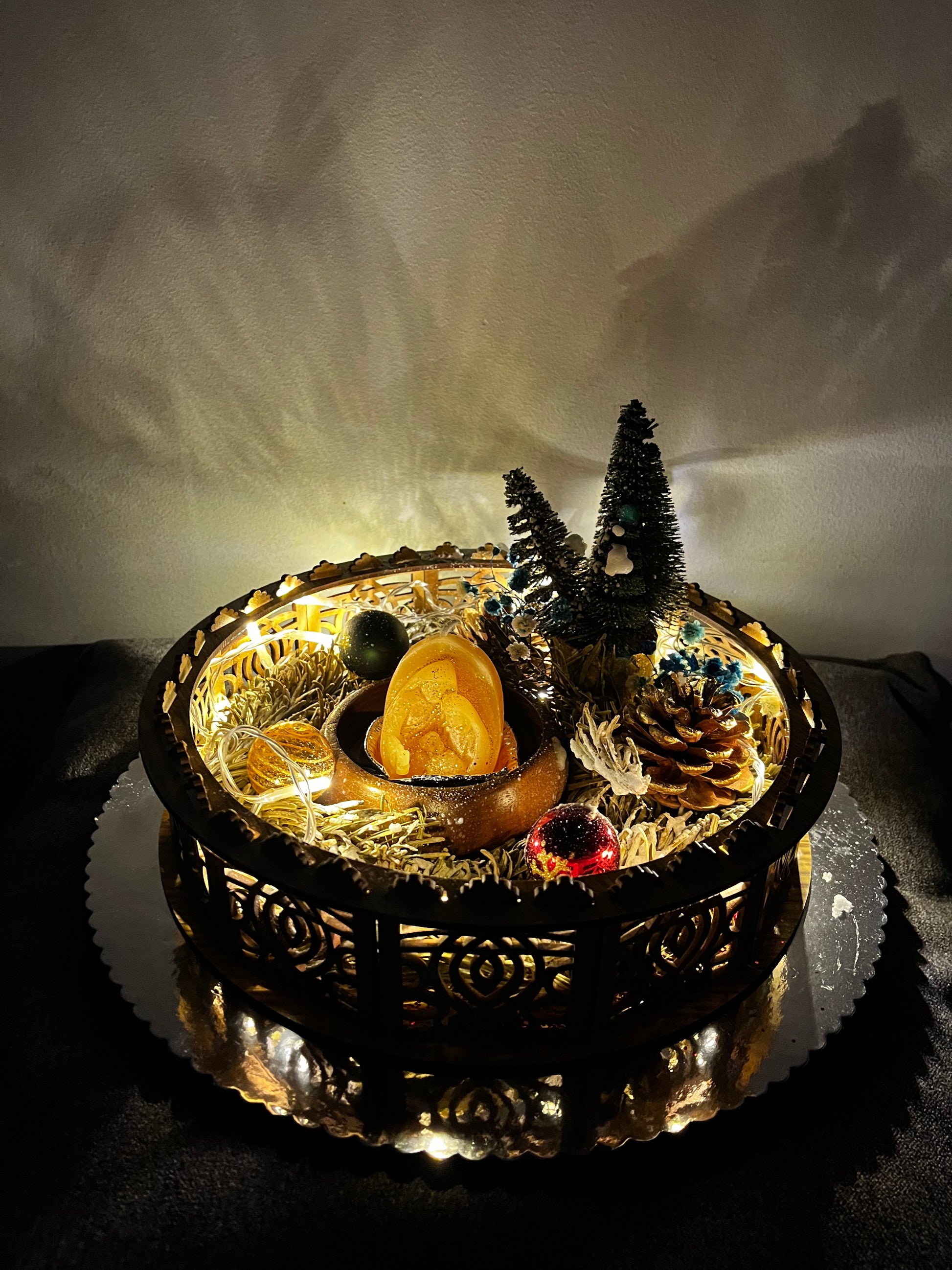 Très beau centre de table pour les fêtes de fin d année, avec une très belle bougie de Noël. Nous y avons ajouté quelques branches de sapin, ainsi que des pommes de pin et dés boules de Noël.