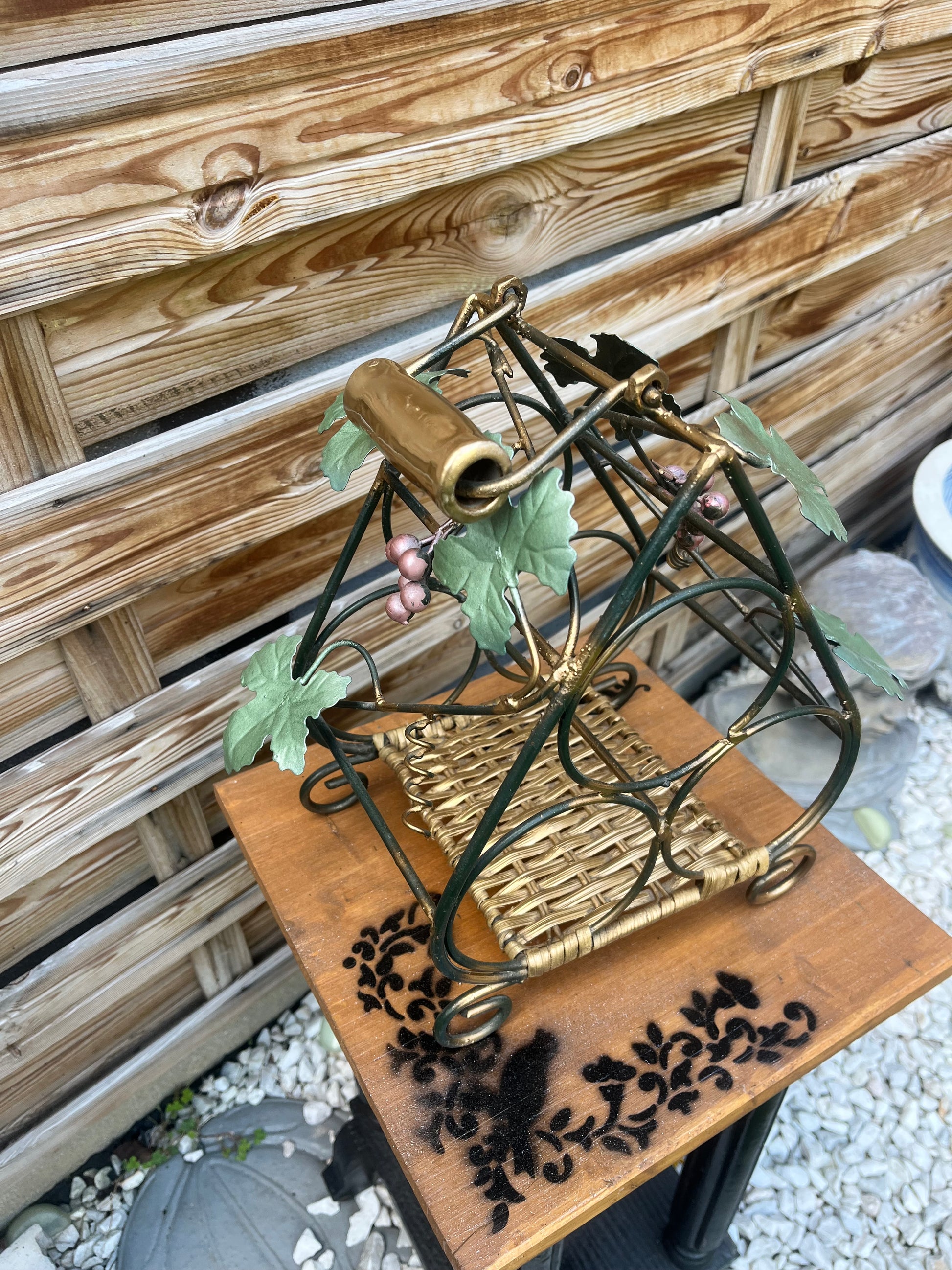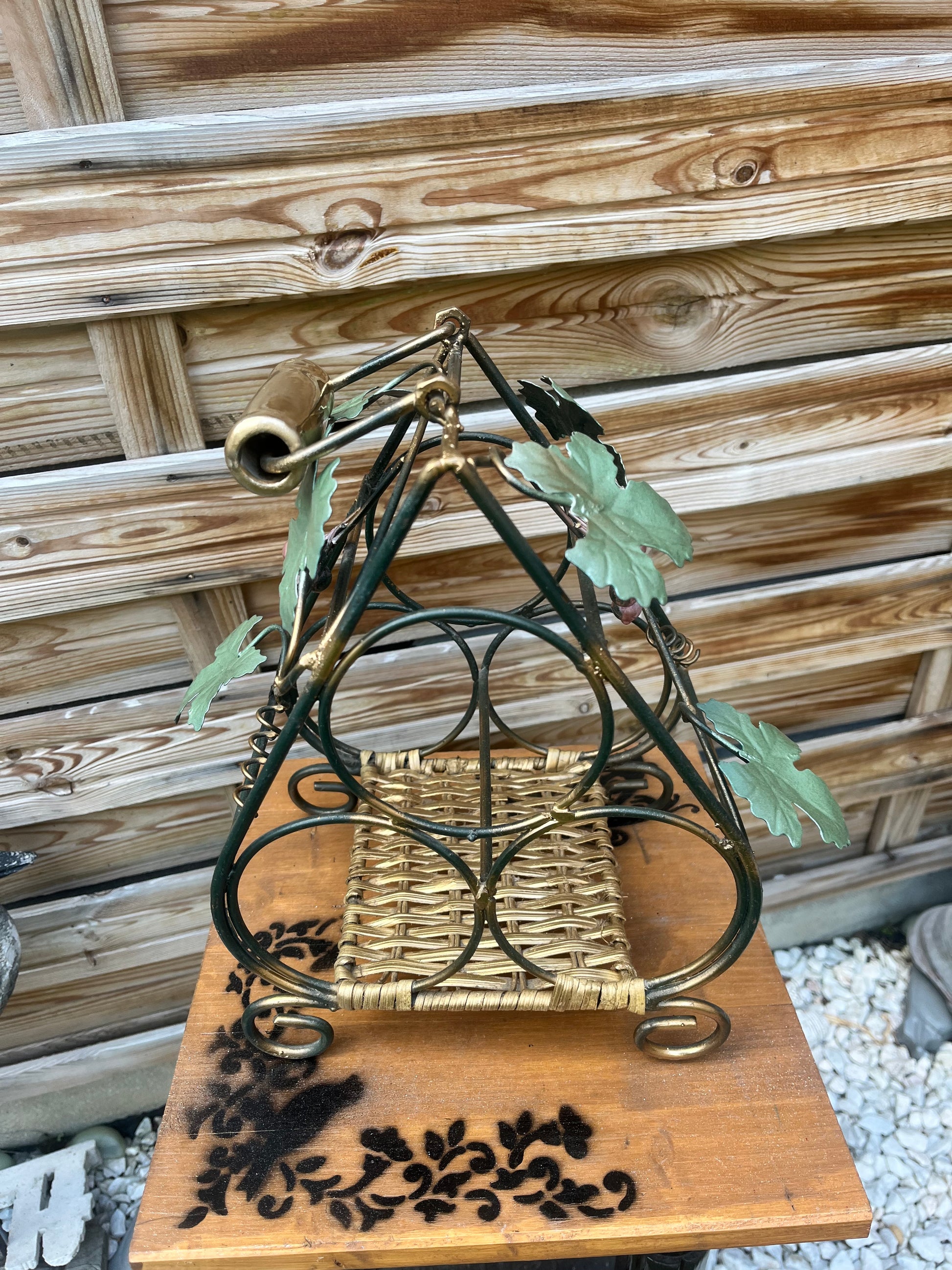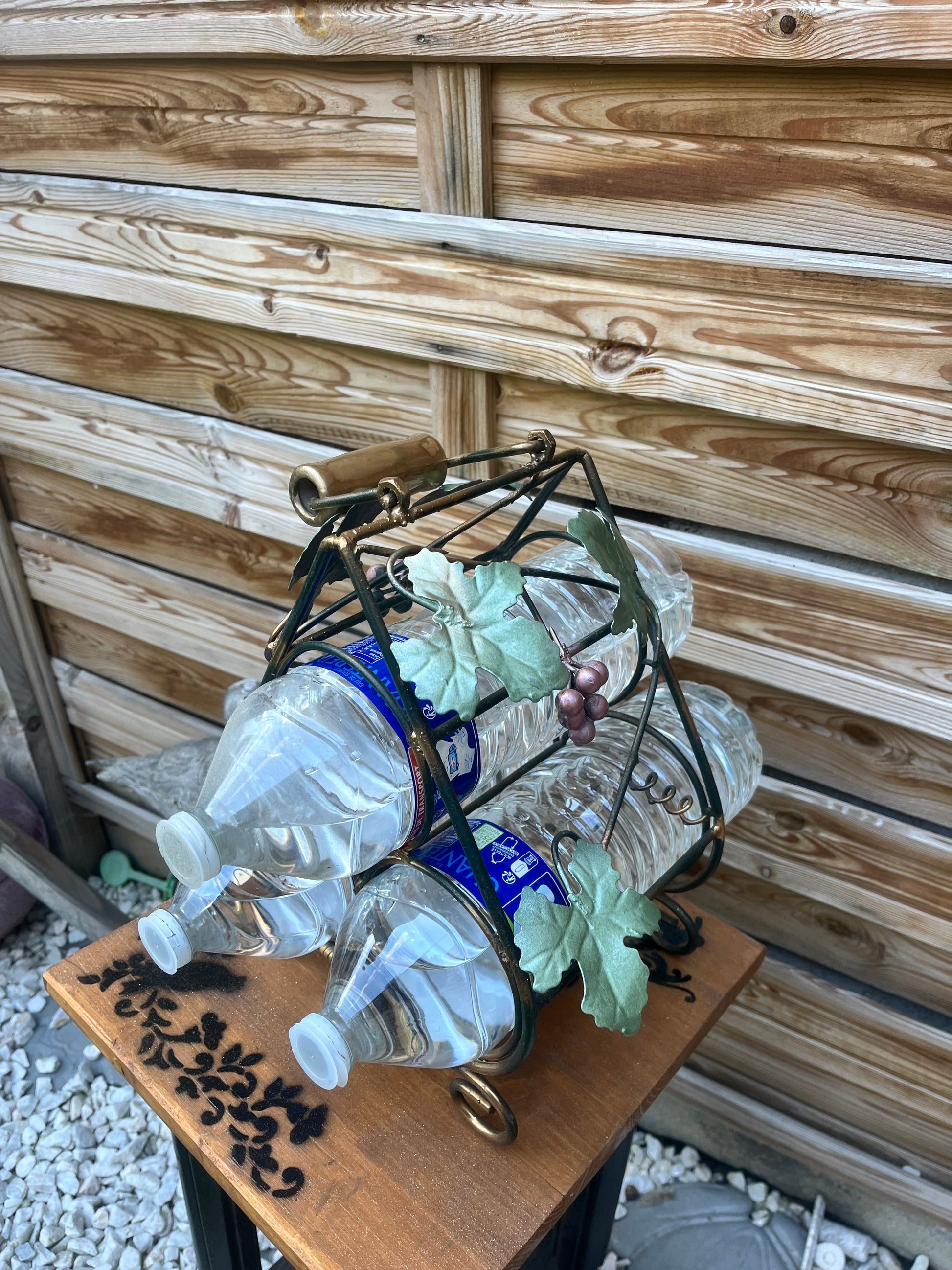 Très beau porte bouteilles noir et or, avec décors de feuilles de vignes vertes. Peut contenir 3 bouteilles.