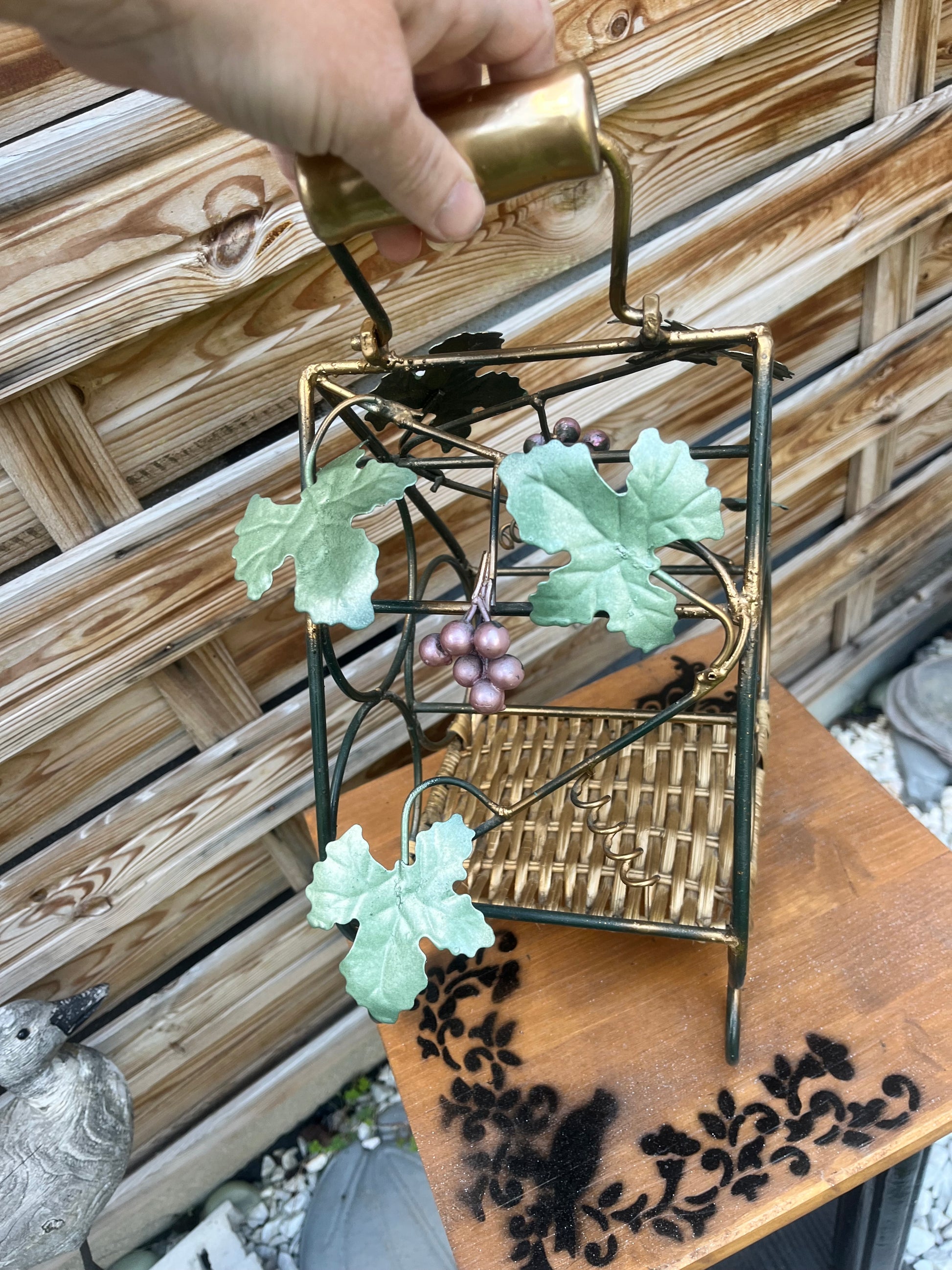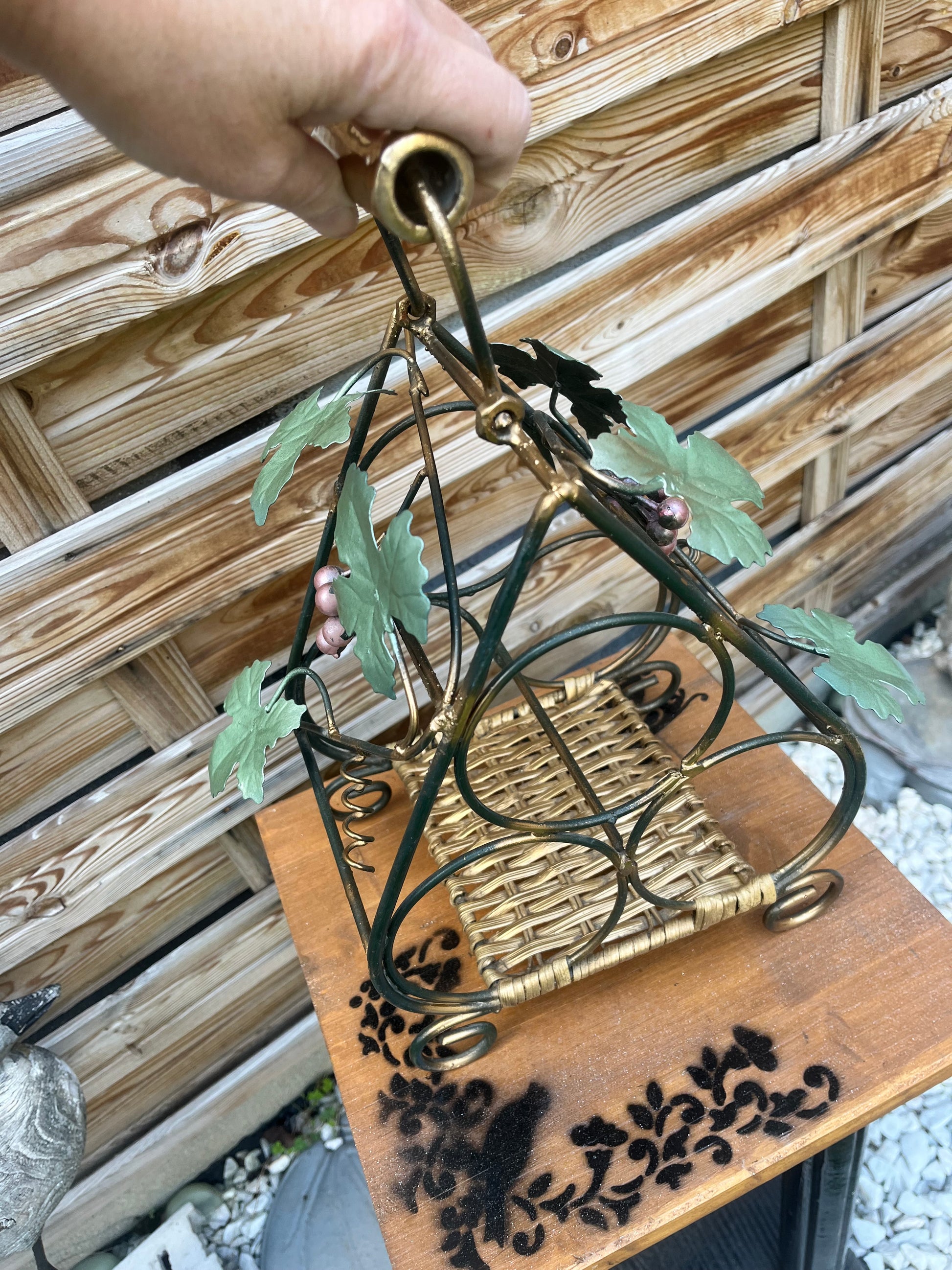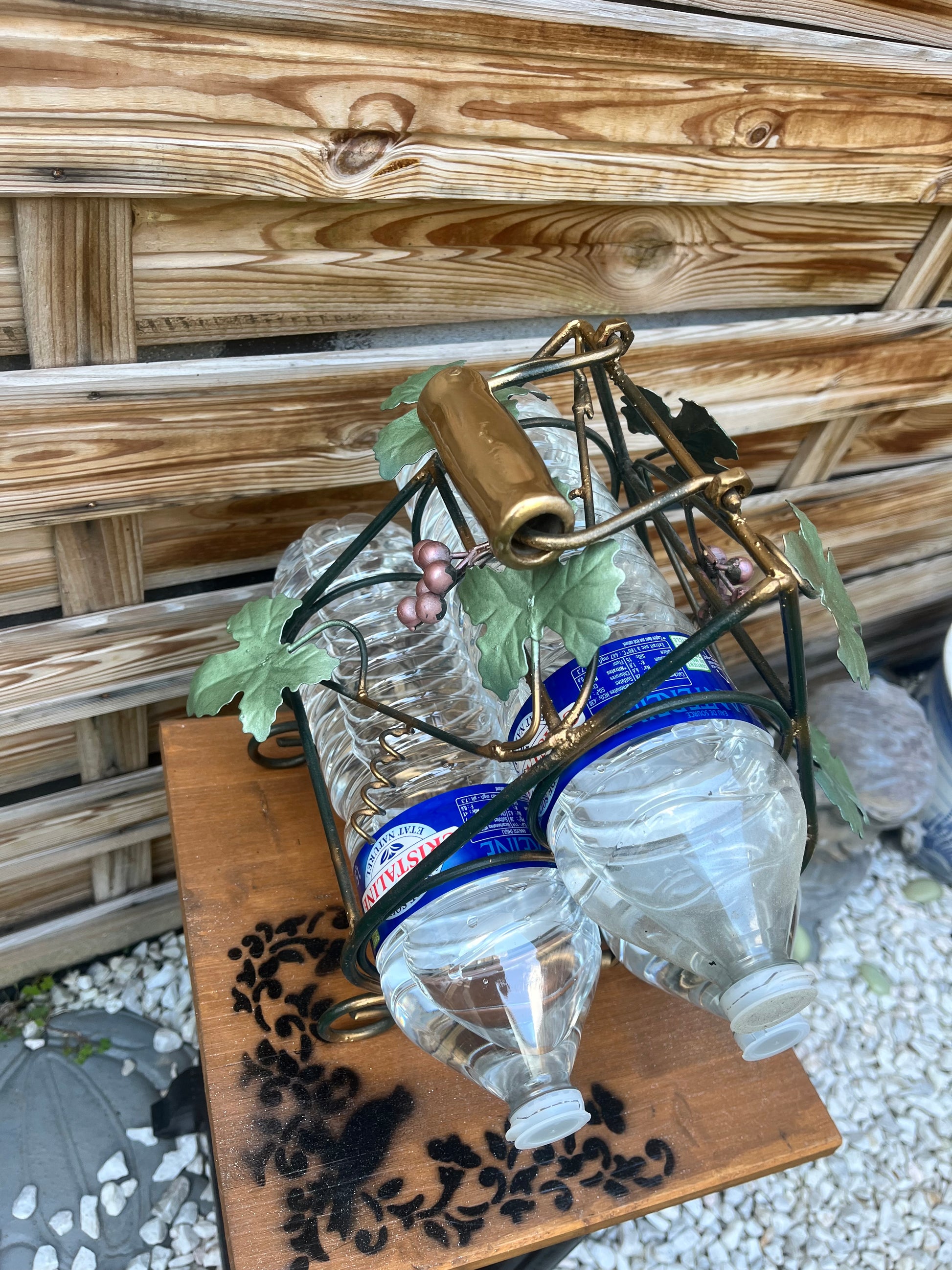 Très beau porte bouteilles noir et or, avec décors de feuilles de vignes vertes. Peut contenir 3 bouteilles.