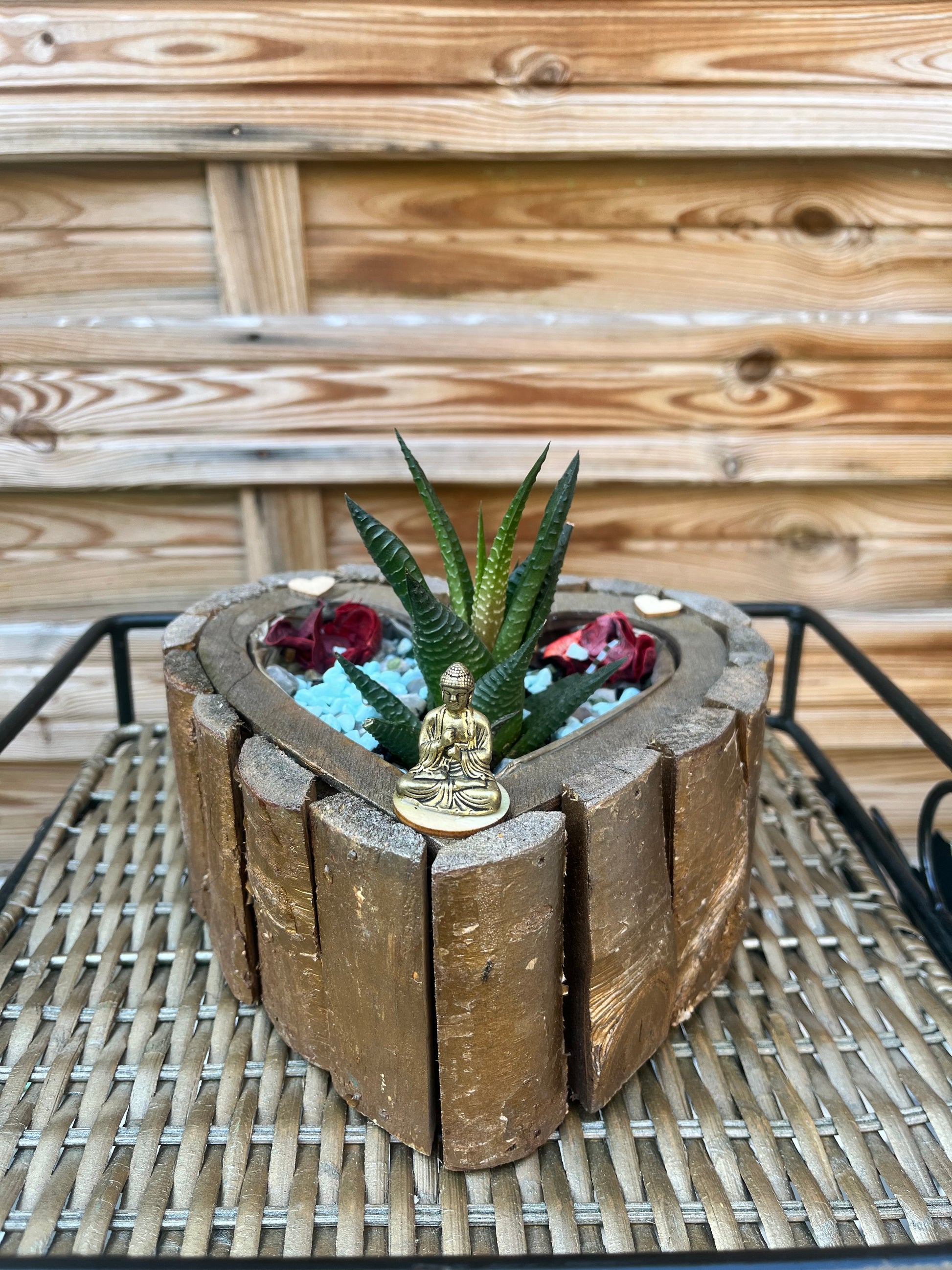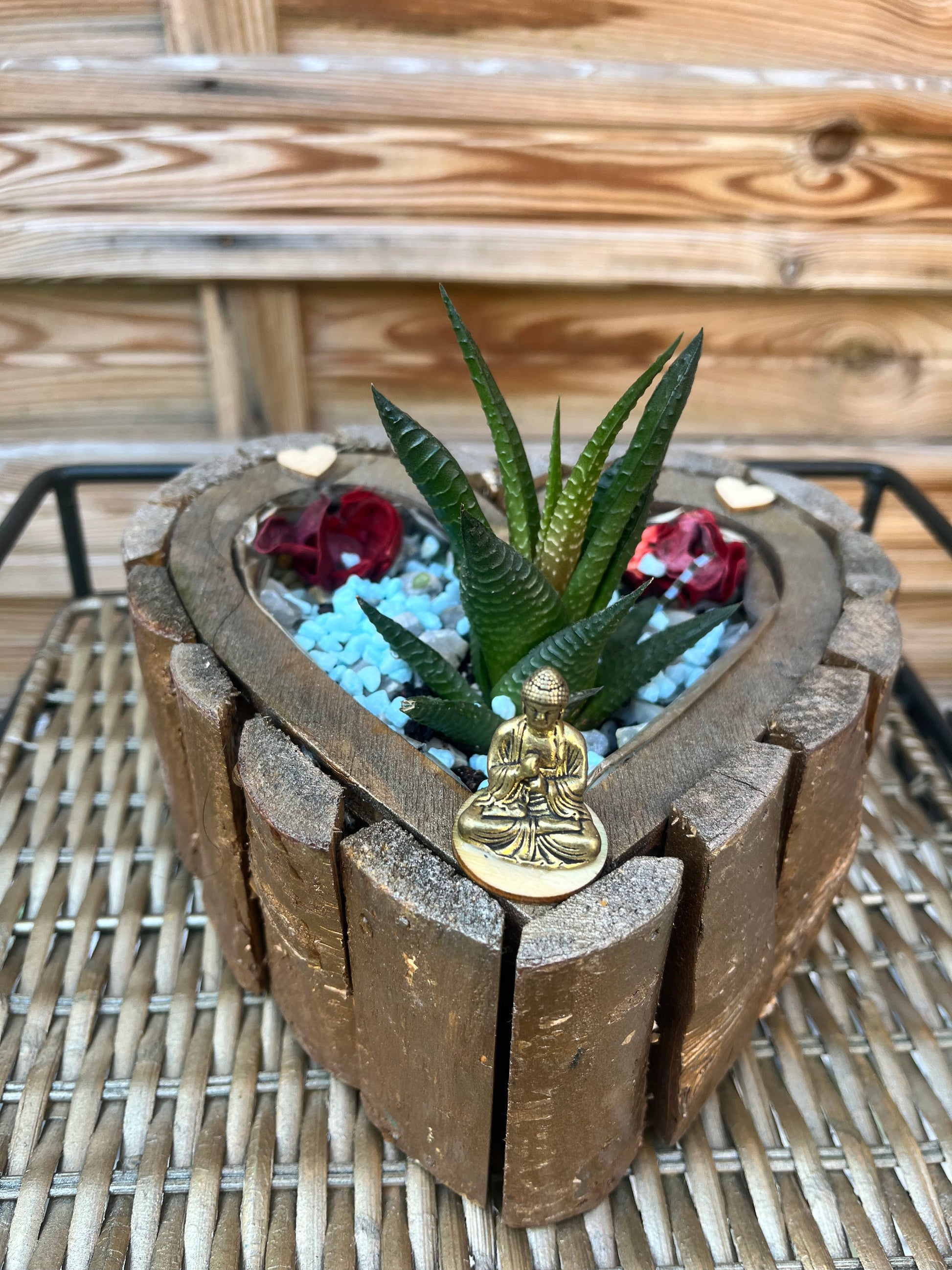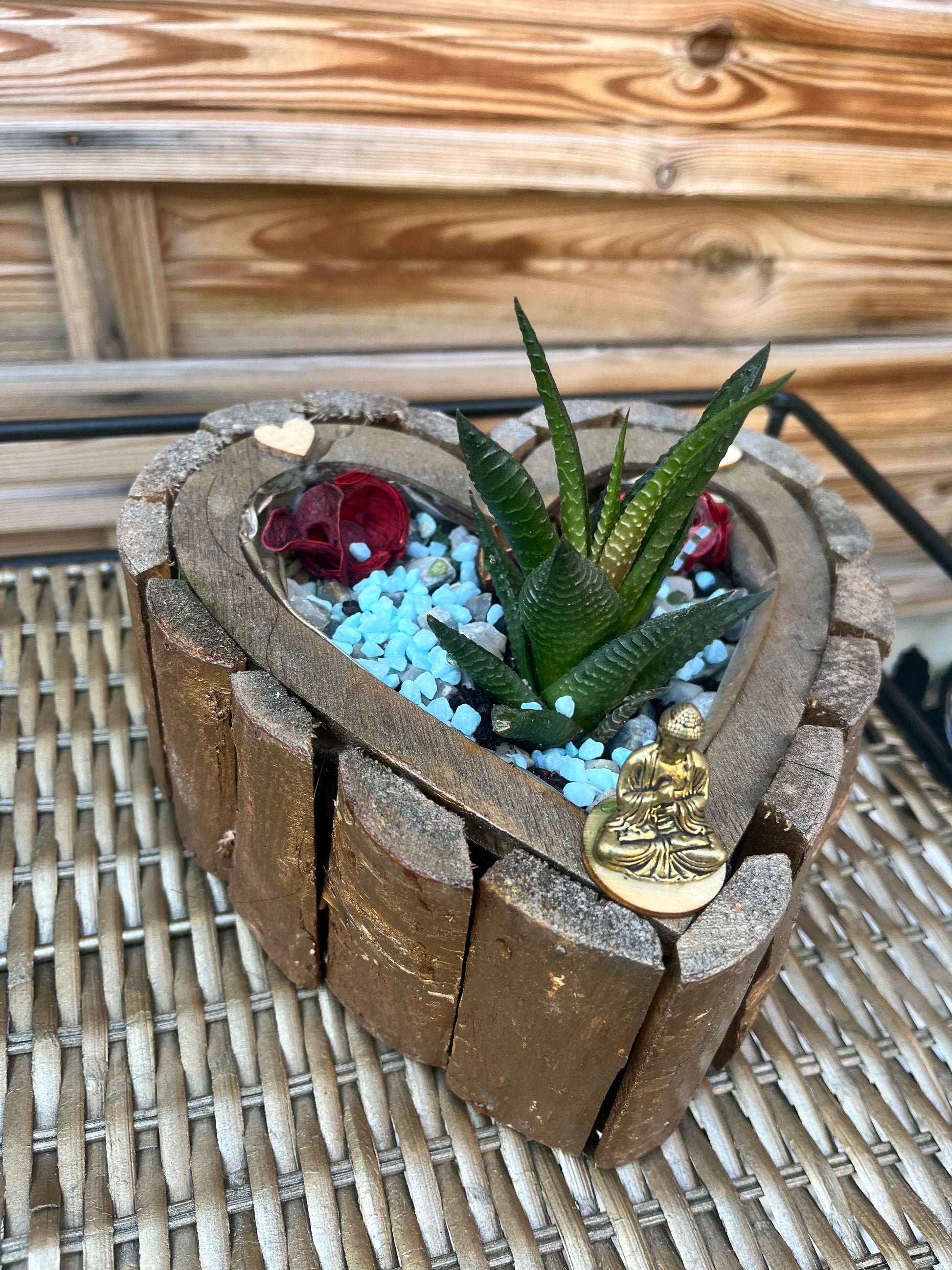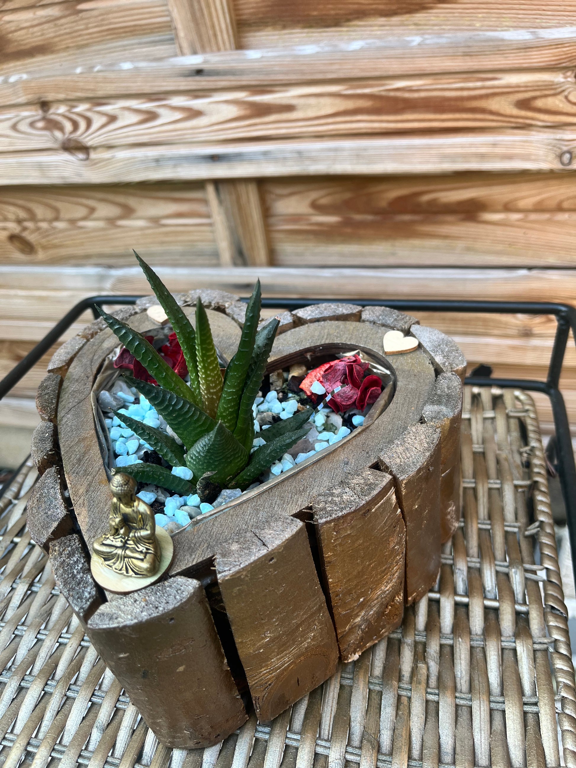 Très beau pot en forme de cœur en bois avec un cactus. le pot est décoré avec des pierres et une petite statue zen, qui inspire au calme.