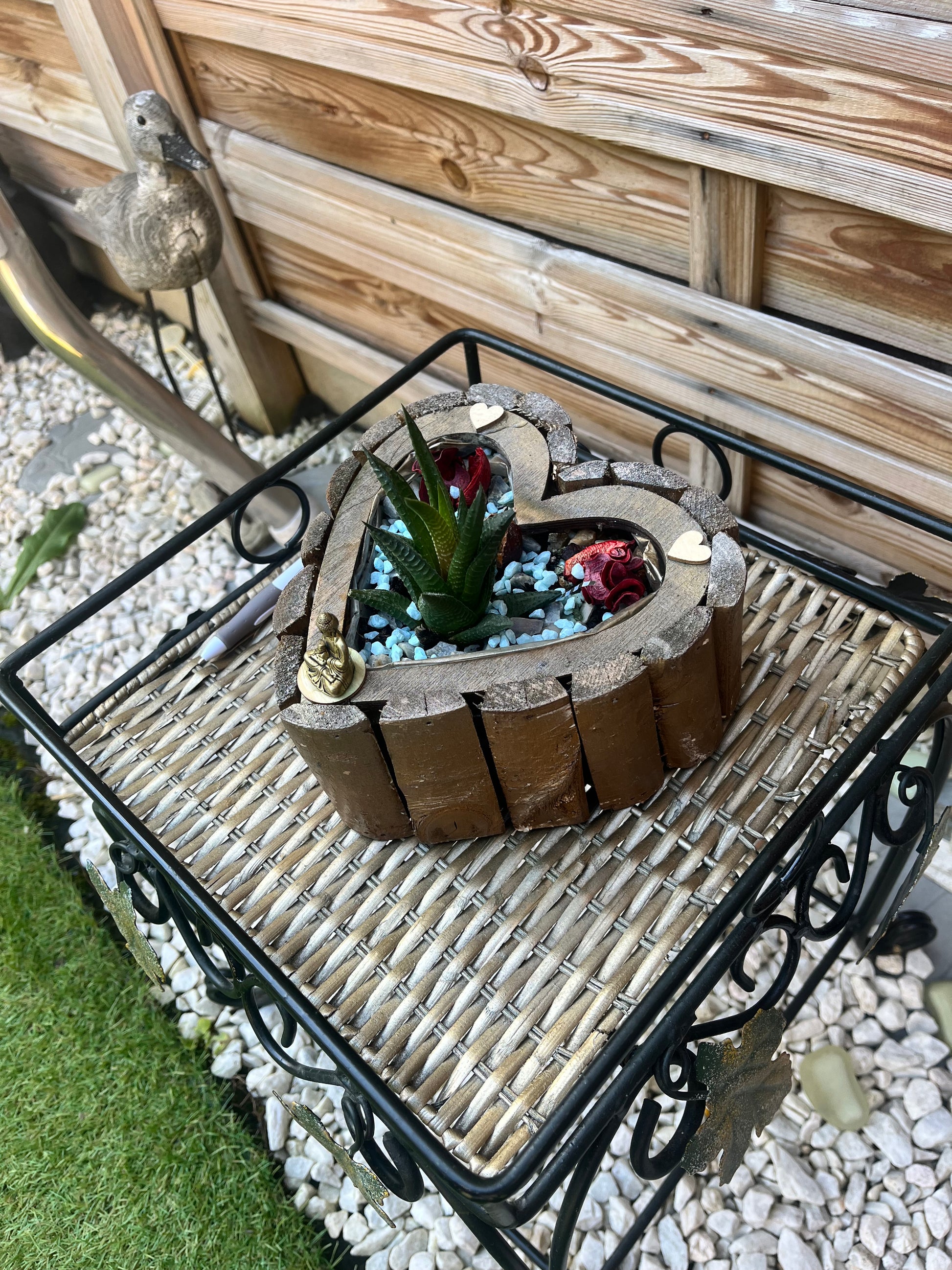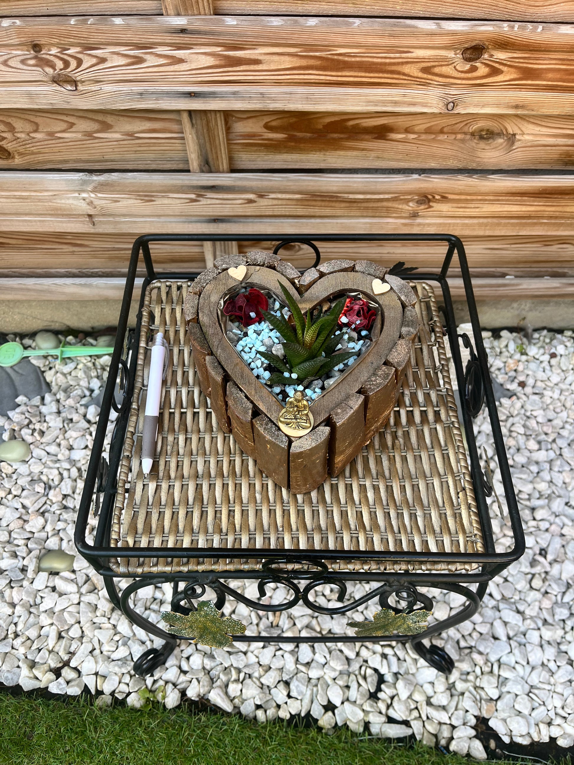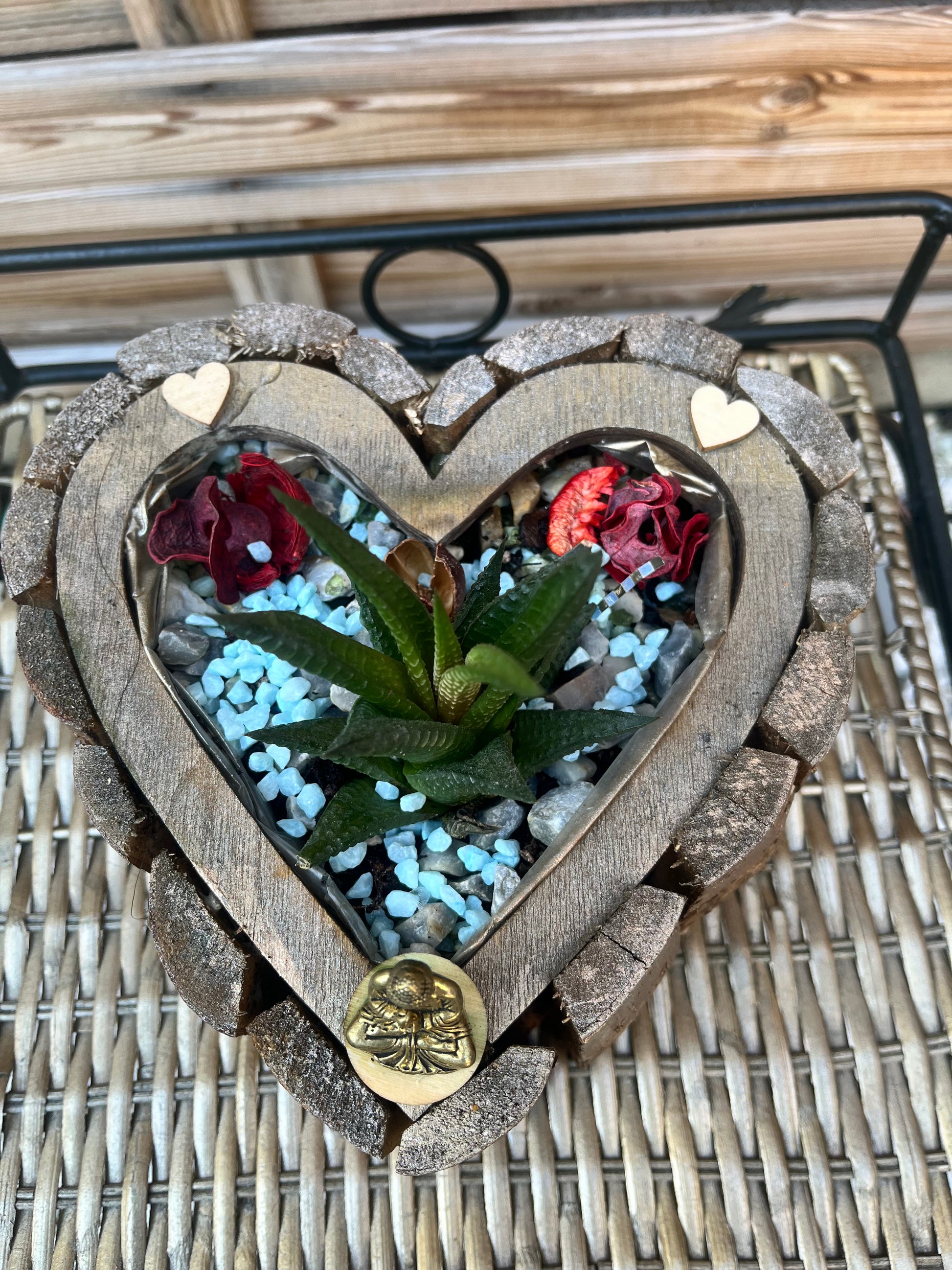 Très beau pot en forme de cœur en bois avec un cactus. le pot est décoré avec des pierres et une petite statue zen, qui inspire au calme.