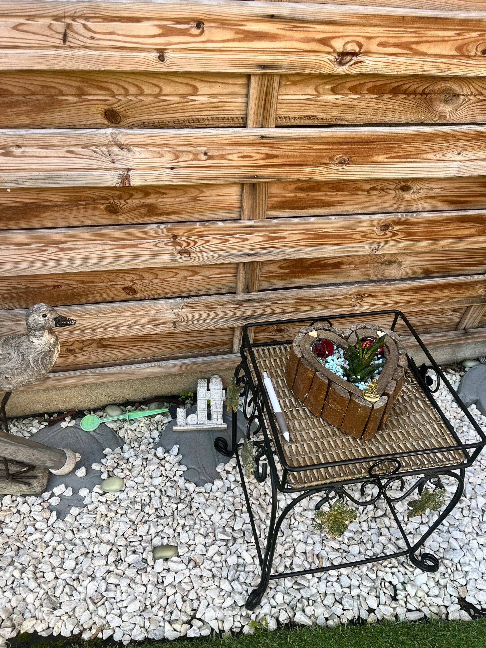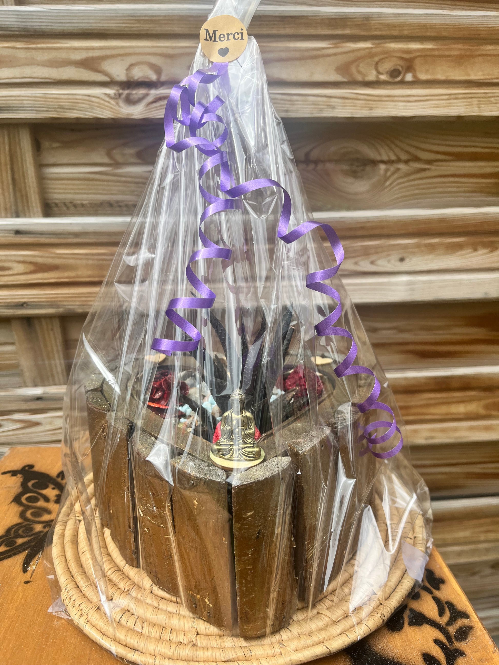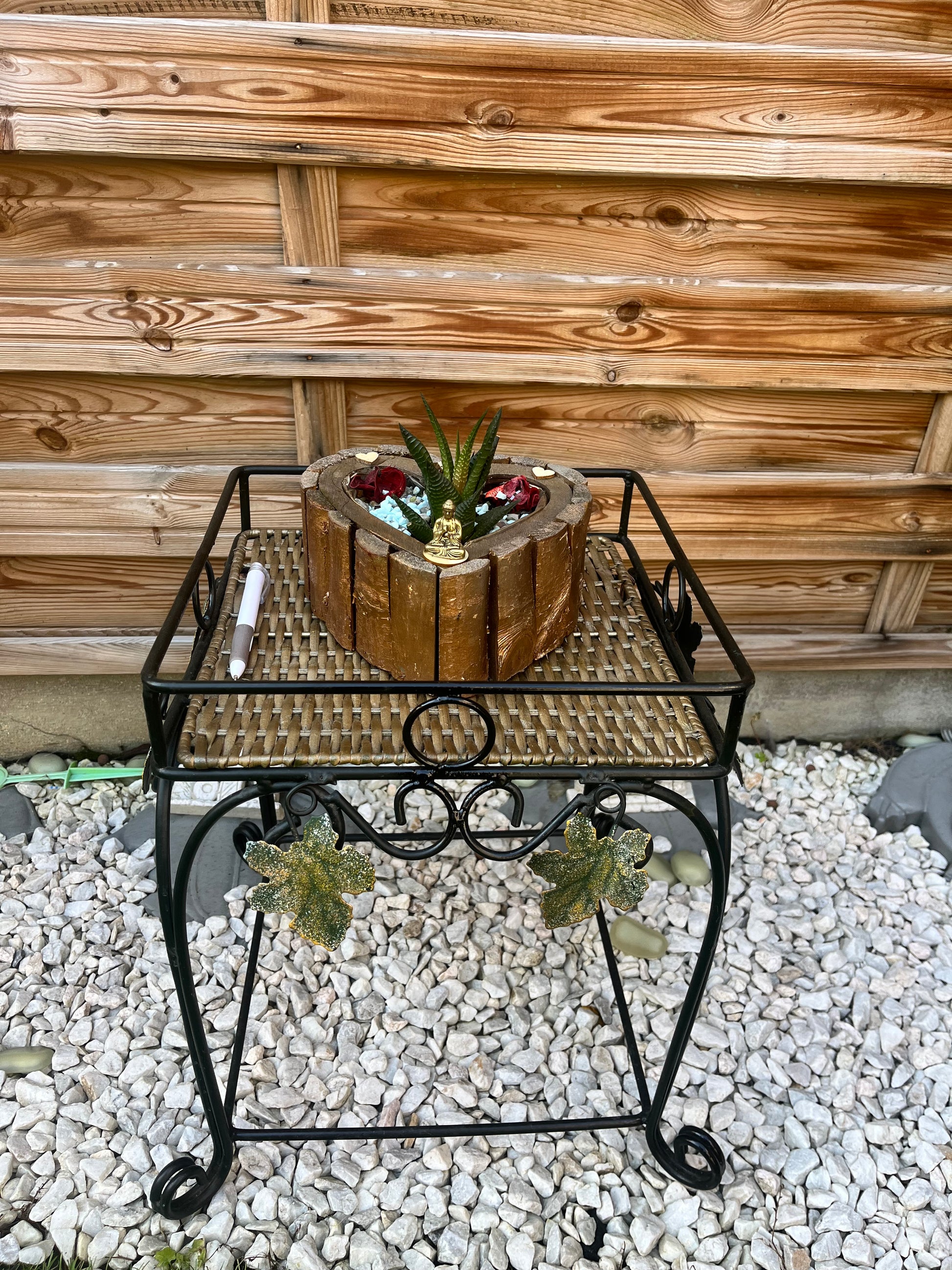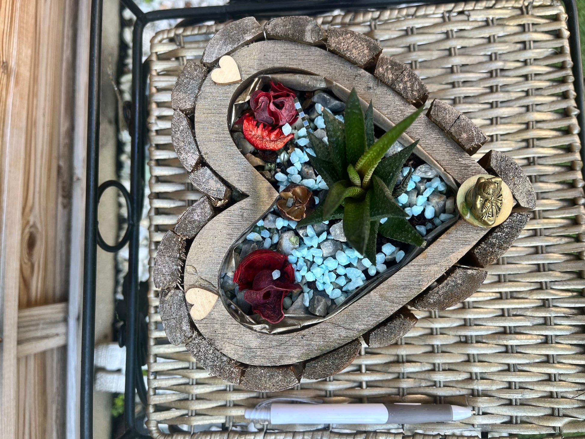 Très beau pot en forme de cœur en bois avec un cactus. le pot est décoré avec des pierres et une petite statue zen, qui inspire au calme.