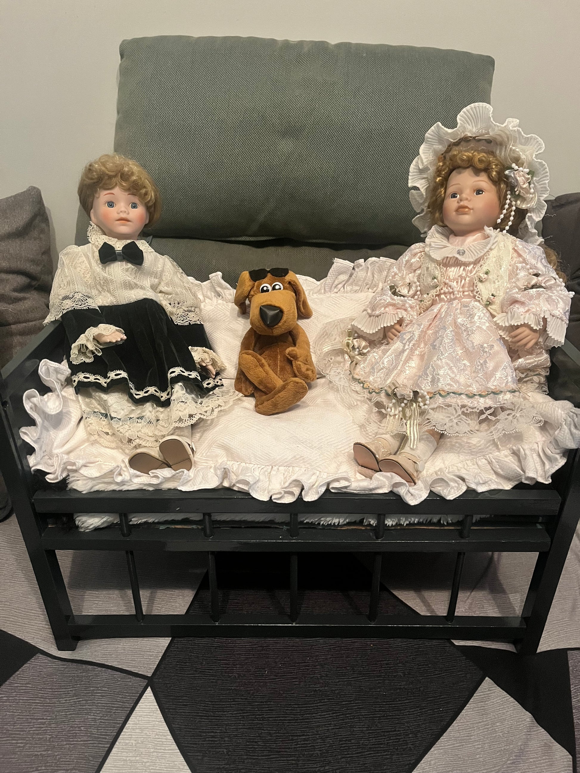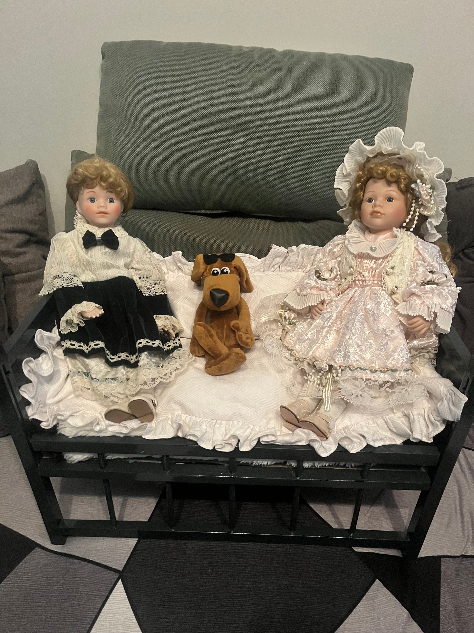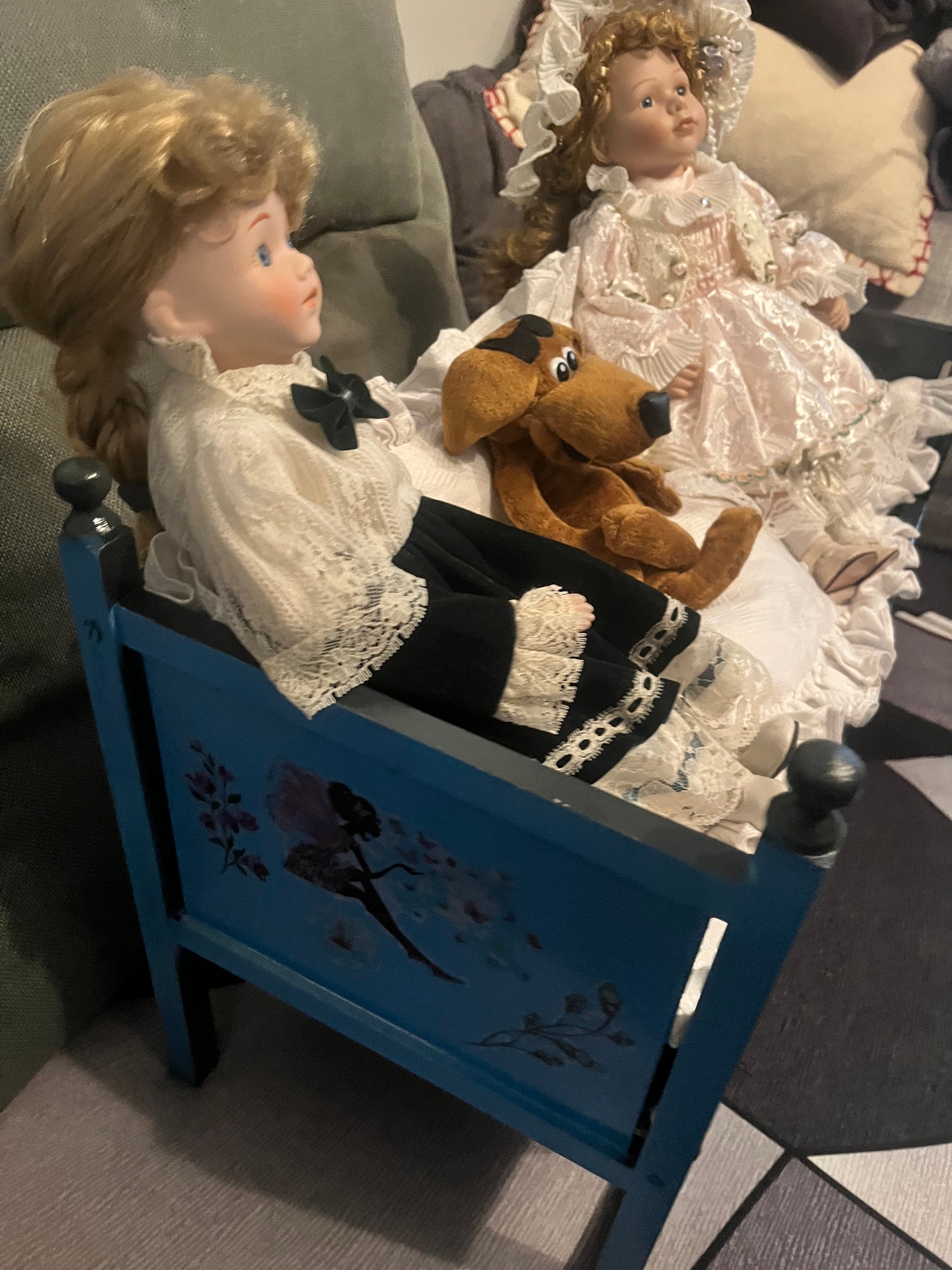 Duo de deux belles poupées anciennes posées sur un canapé lit, elles sont accompagnées d'un petit chien.