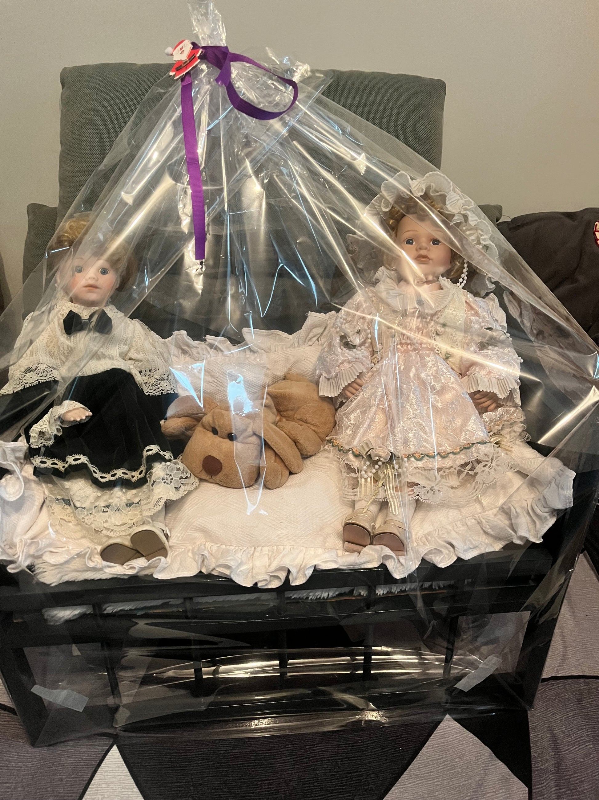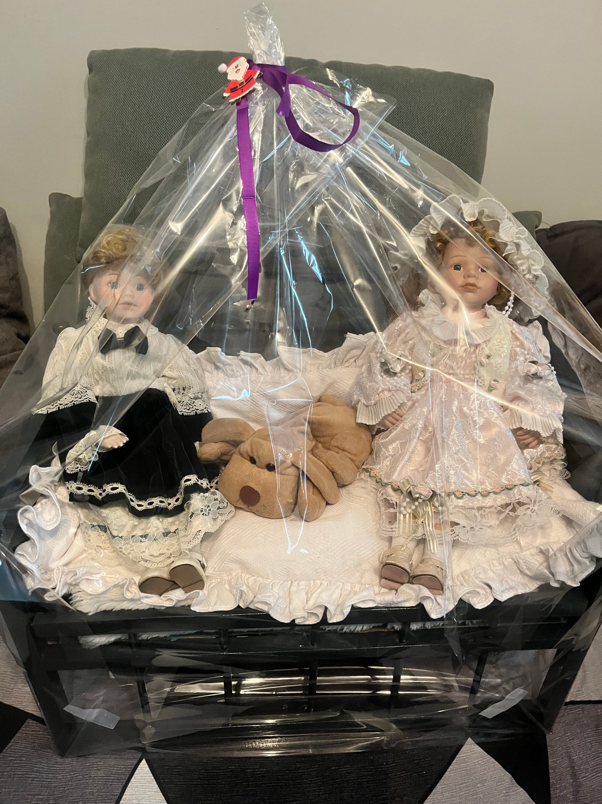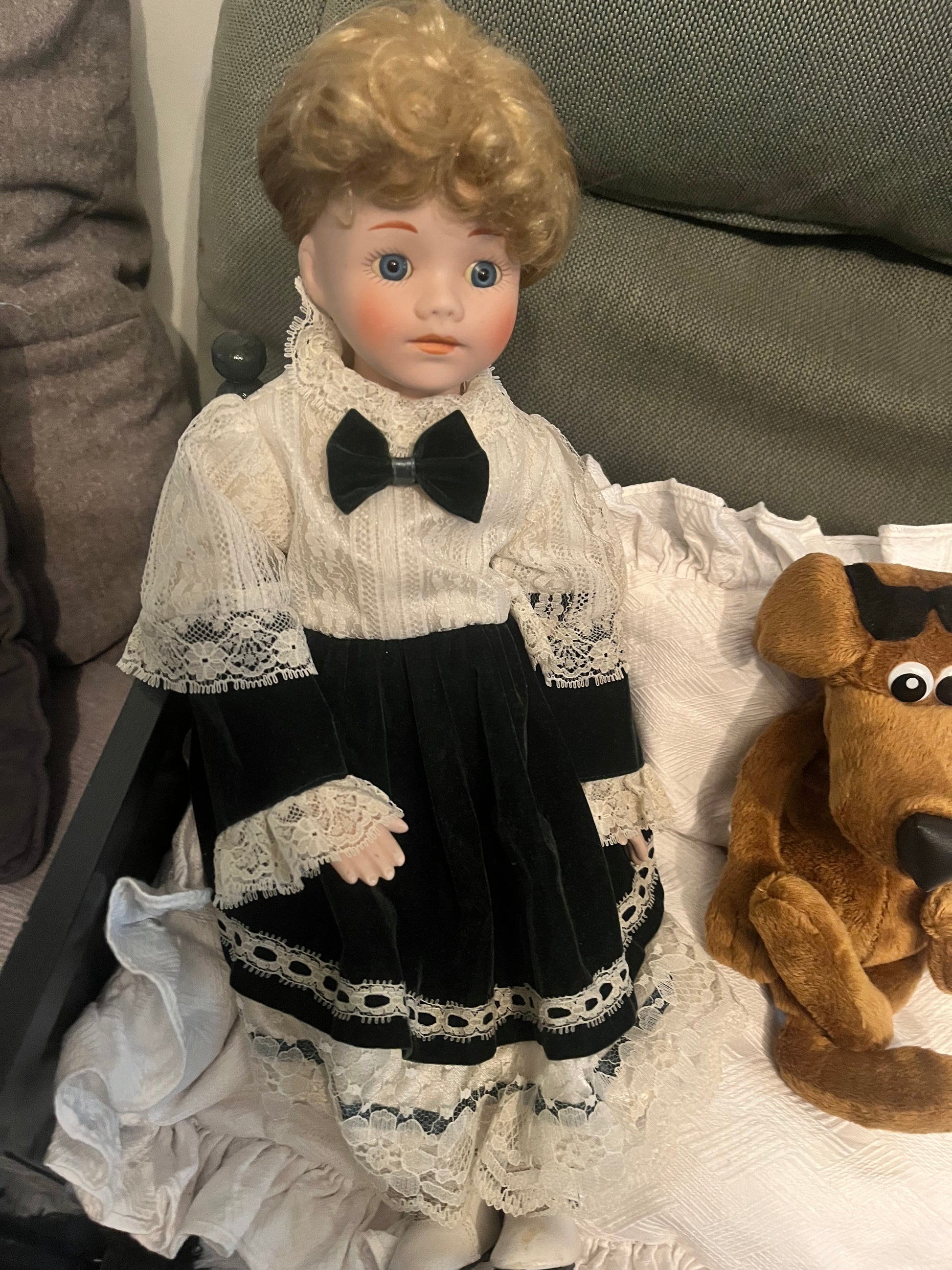 Duo de deux belles poupées anciennes posées sur un canapé lit, elles sont accompagnées d'un petit chien.