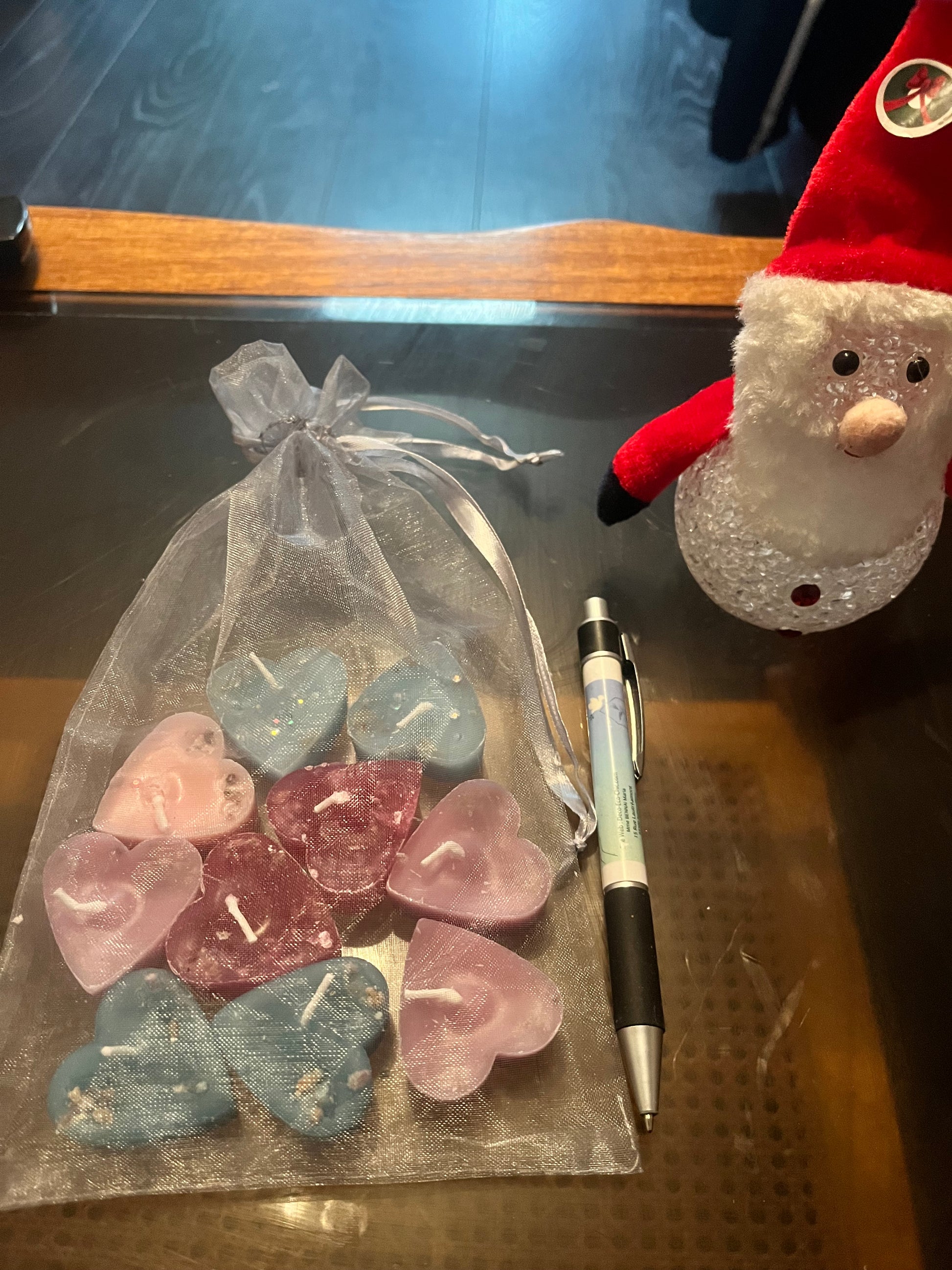 Petit sac avec 10 petites mini bougies cœur de différentes couleurs + 1 gratuite