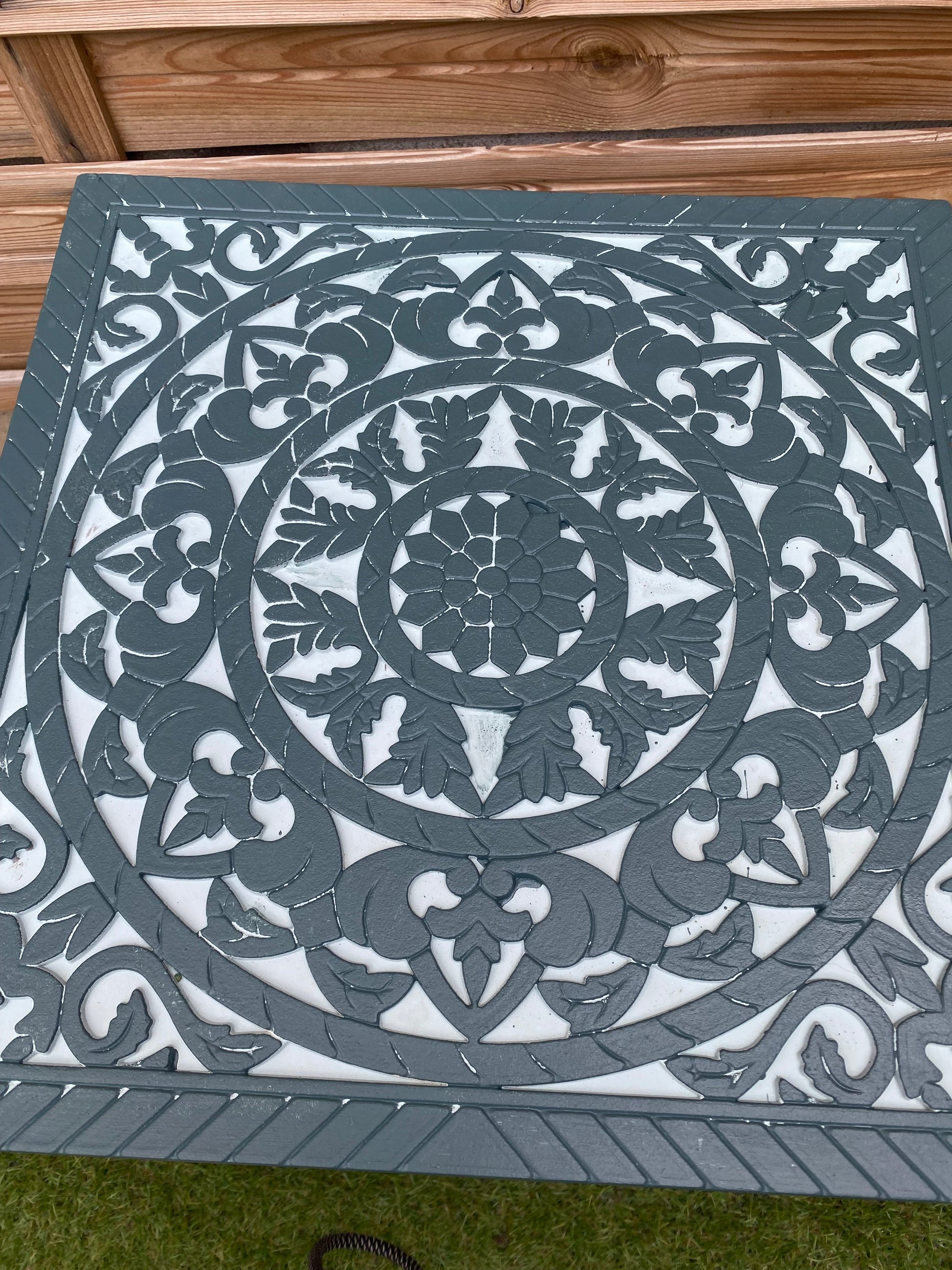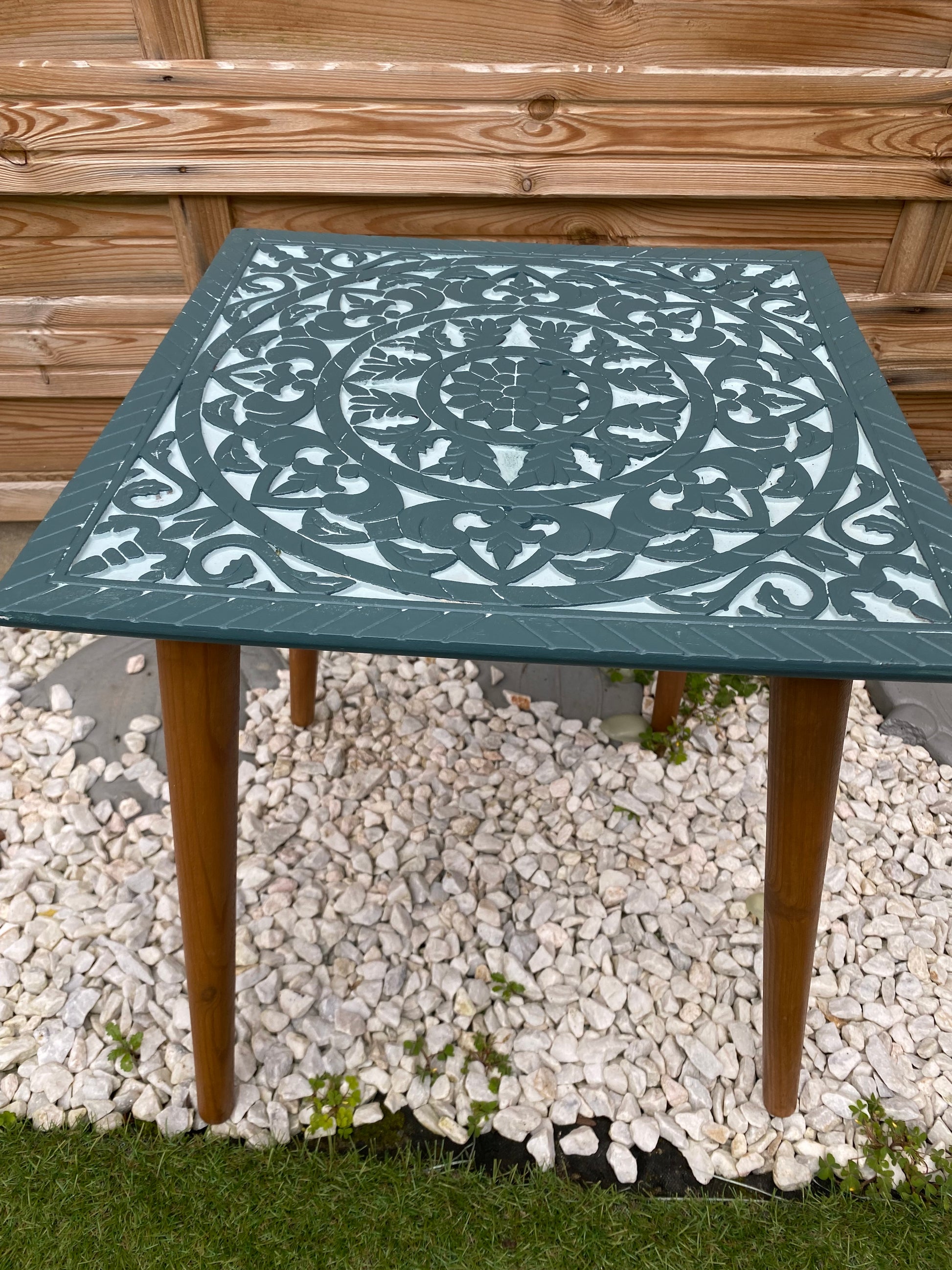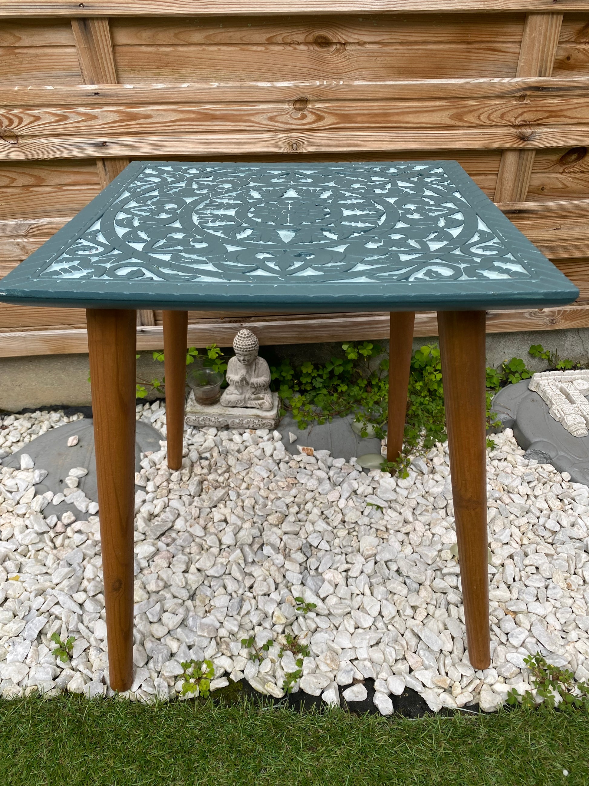 Petite table plateau couleur bleu/vert avec pieds en bois. Apportes de la gaieté et du fun à l'endroit que vous voulez embellir.
