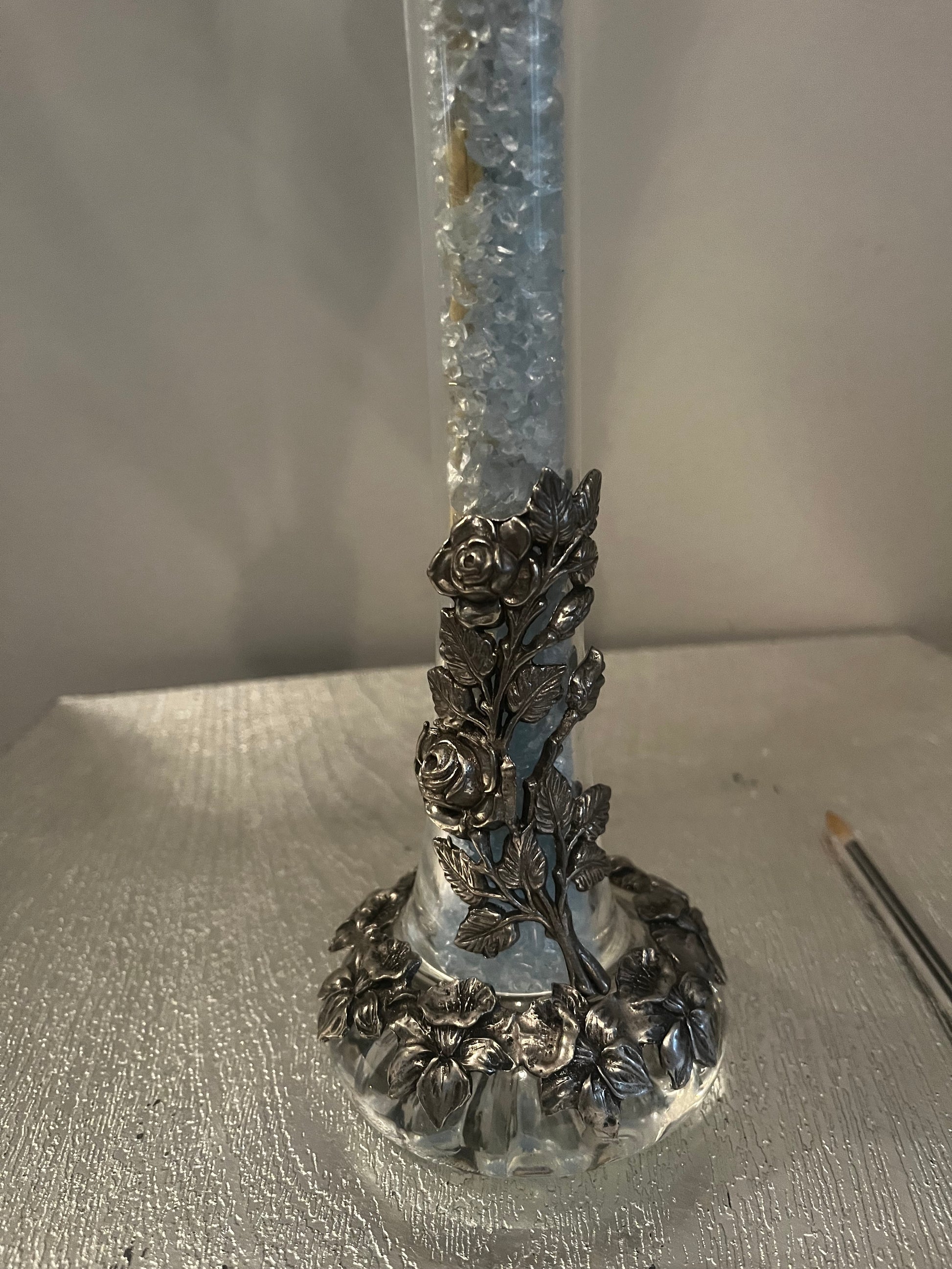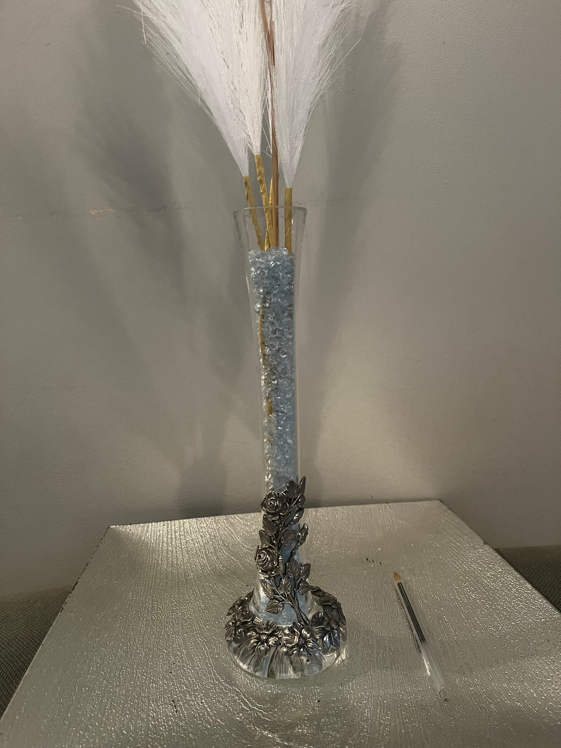 Très beau vase en verre et décorations en étain.