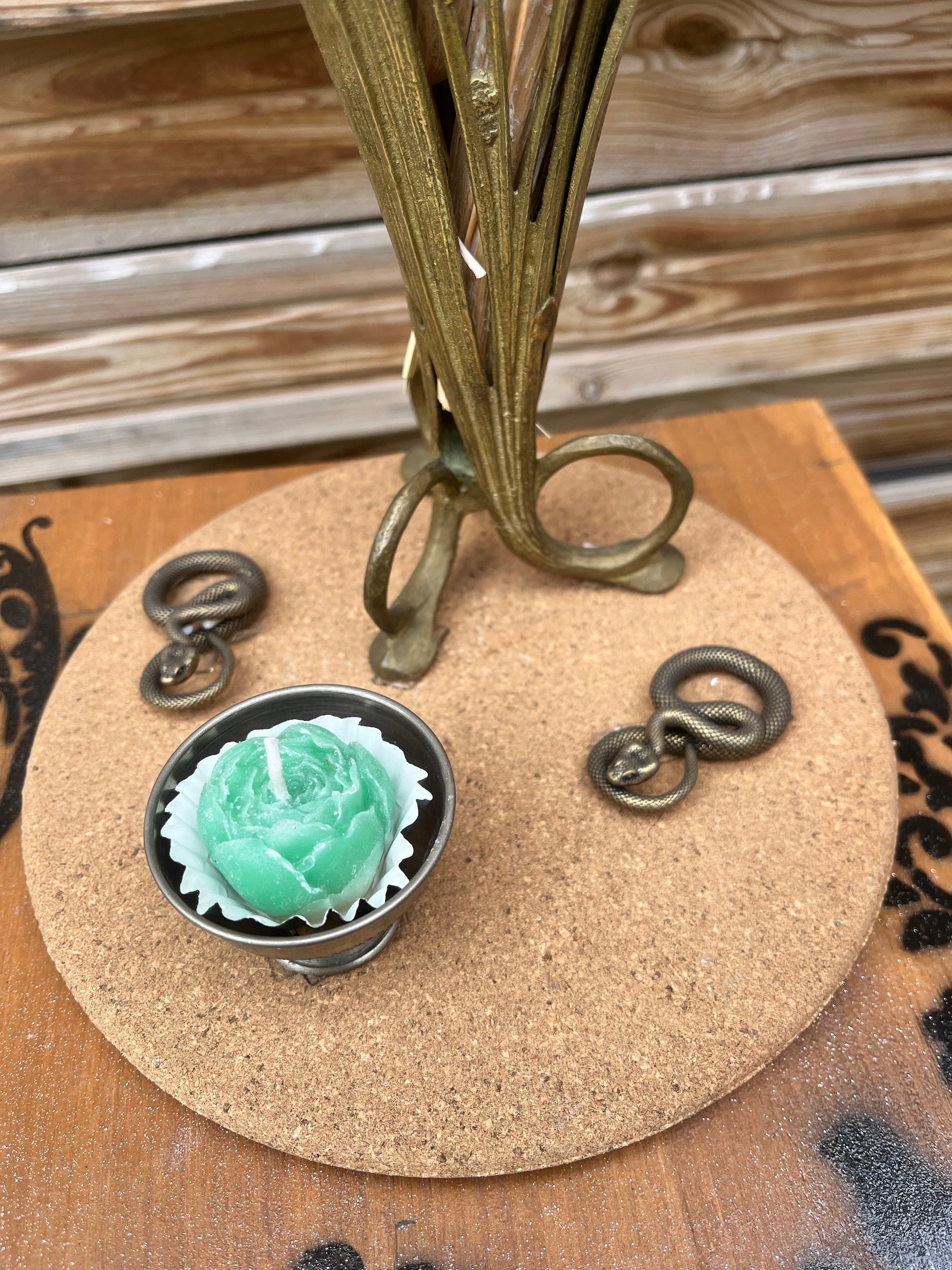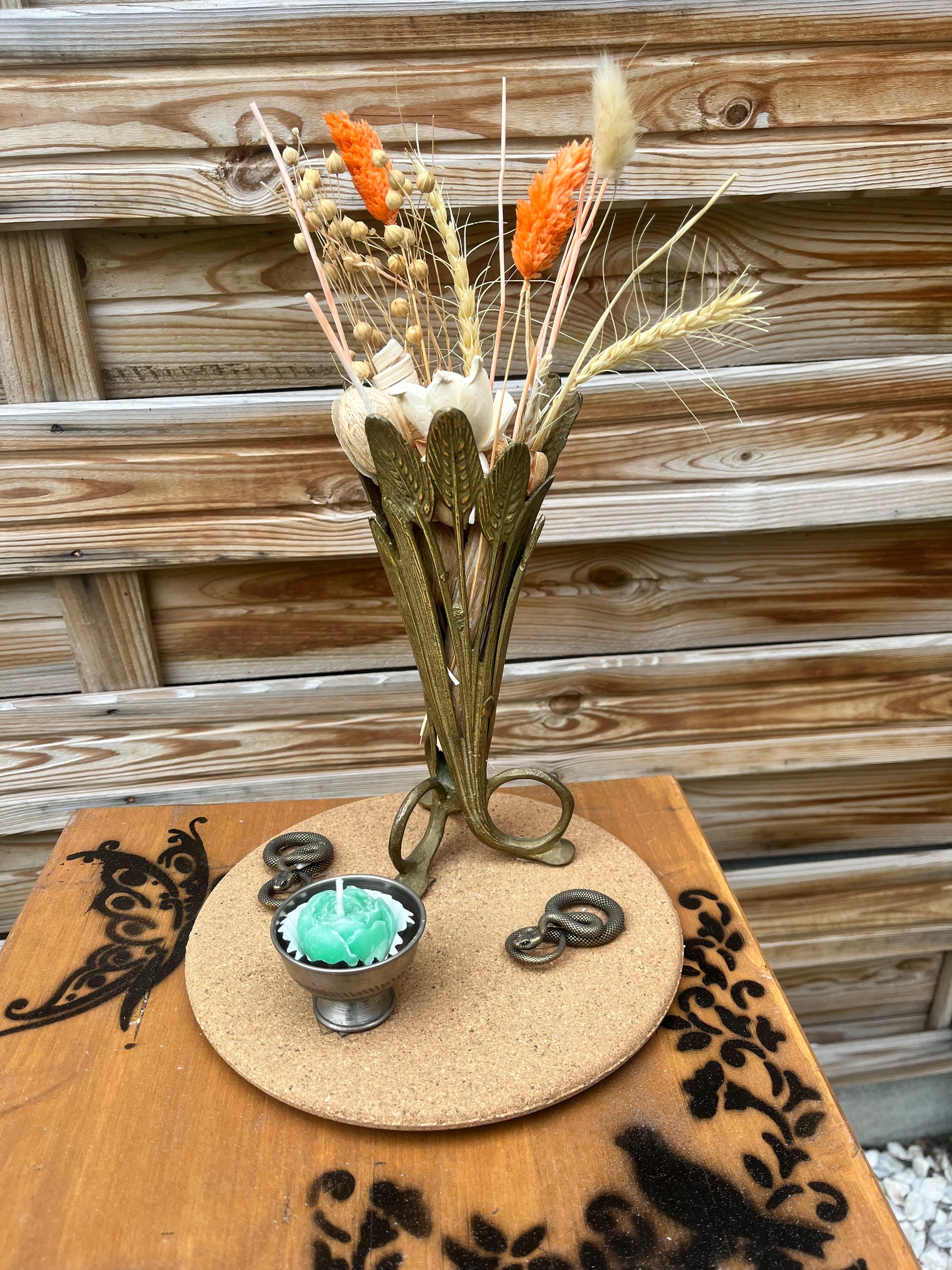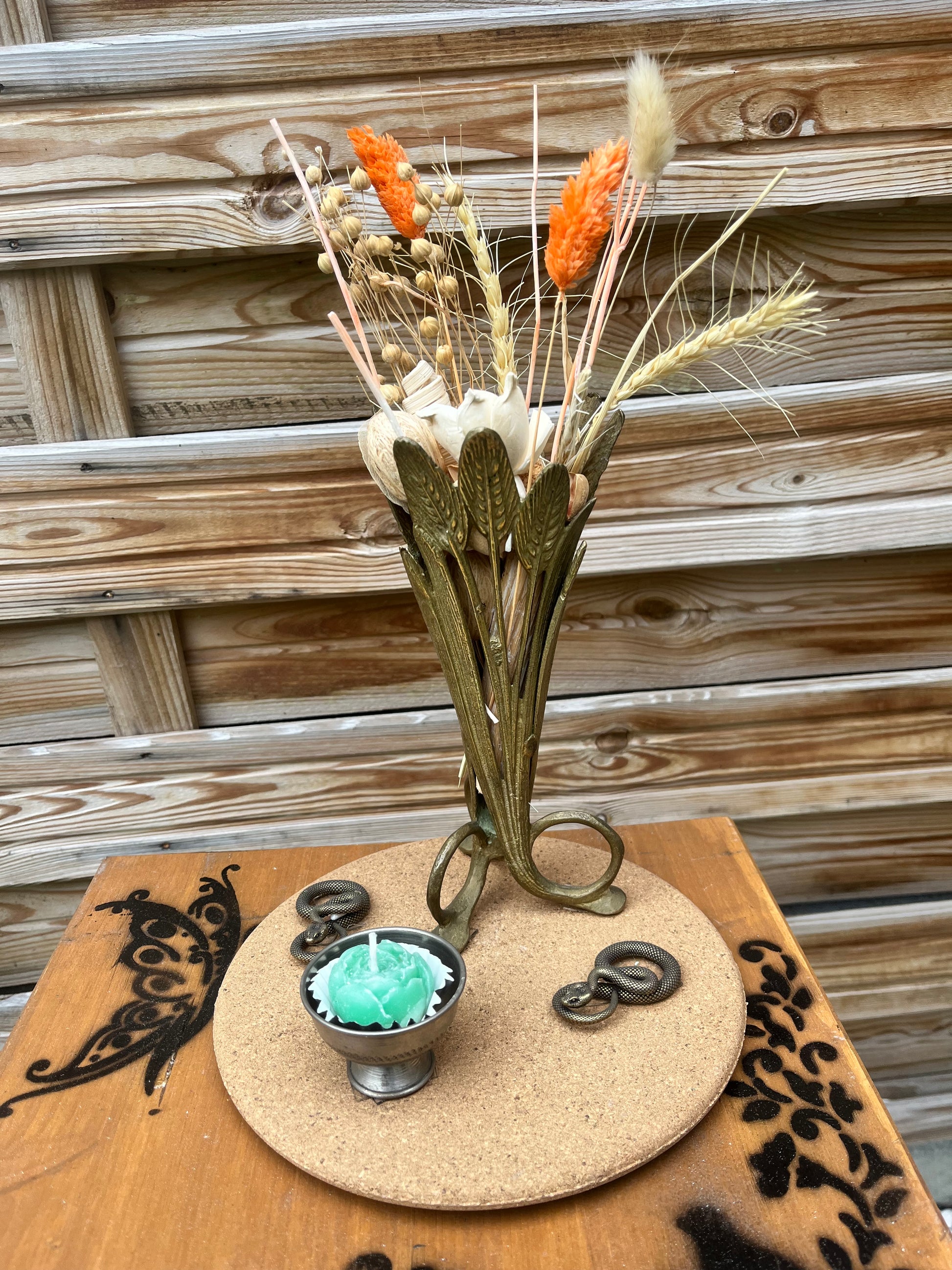 Magnifique coupe, en forme de vase, en métal assez lourd, ouvert sur les cotés, ne peut convenir qu'à des fleurs séchées, C'est un très bel objet, très élégant. On y ajoute 2 petits serpents ainsi qu'une coupelle avec bougie. Le tout posé sur un plateau en liège.